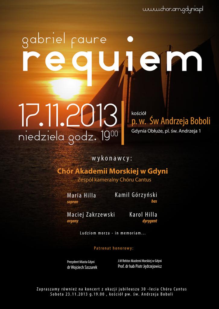 W dniu 17 listopada br. o godz. 19.00 zapraszamy do kościoła św. Andrzeja Boboli w Gdyni Obłużu na koncert Chóru Akademii Morskiej w Gdyni, Zespołu kameralnego Chóru Cantus oraz zaproszonych solistów, którzy wykonają m.in. przejmujące dzieło Gabriela Faure (czyt. Fore) - Requiem. Wydarzenie to będzie upamiętniać wszystkich tych, którzy zginęli na morzu, a o których jako mieszkańcy Miasta z Morza i Marzeń powinniśmy pamiętać. Koncert poświęcony jest również pamięci zmarłych pracowników Akademii Morskiej.