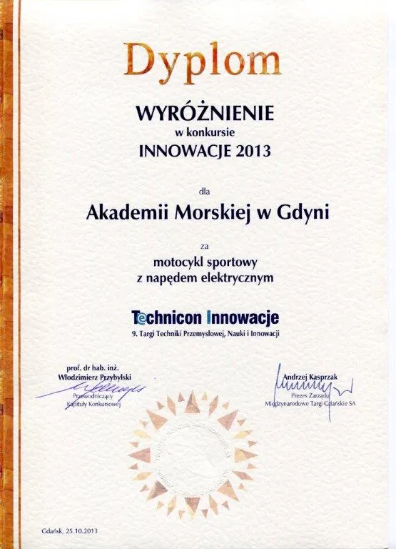 Podczas dwóch dni trwania targów, obsługę stanowiska Wydziału Elektrycznego prowadzili studenci – członkowie KN EVPL – z IV roku Łukasz Potrykus i Michał Wrąbel oraz studenci z III roku Jarosław Miłosz i Piotr Zalewski. Zwiedzający mieli możliwość zapoznania się z konstrukcją i parametrami prezentowanych pojazdów, motocykla sportowego z napędem elektrycznym oraz hulajnogi EV. Każdy miał możliwość samodzielnego przetestowania pojazdów. W targach udział wzięło 64 wystawców takich jak uczelnie, instytuty, ośrodki badawcze, firmy. Kapituła targów w konkursie INNOWACJE 2013 przyznała łącznie 18 nagród w tym wyróżnienie dla Akademii Morskiej w Gdyni za motocykl sportowy z napędem elektrycznym. Wyróżnienie odebrał opiekun KN EVPL dr inż. Andrzej Łebkowski.