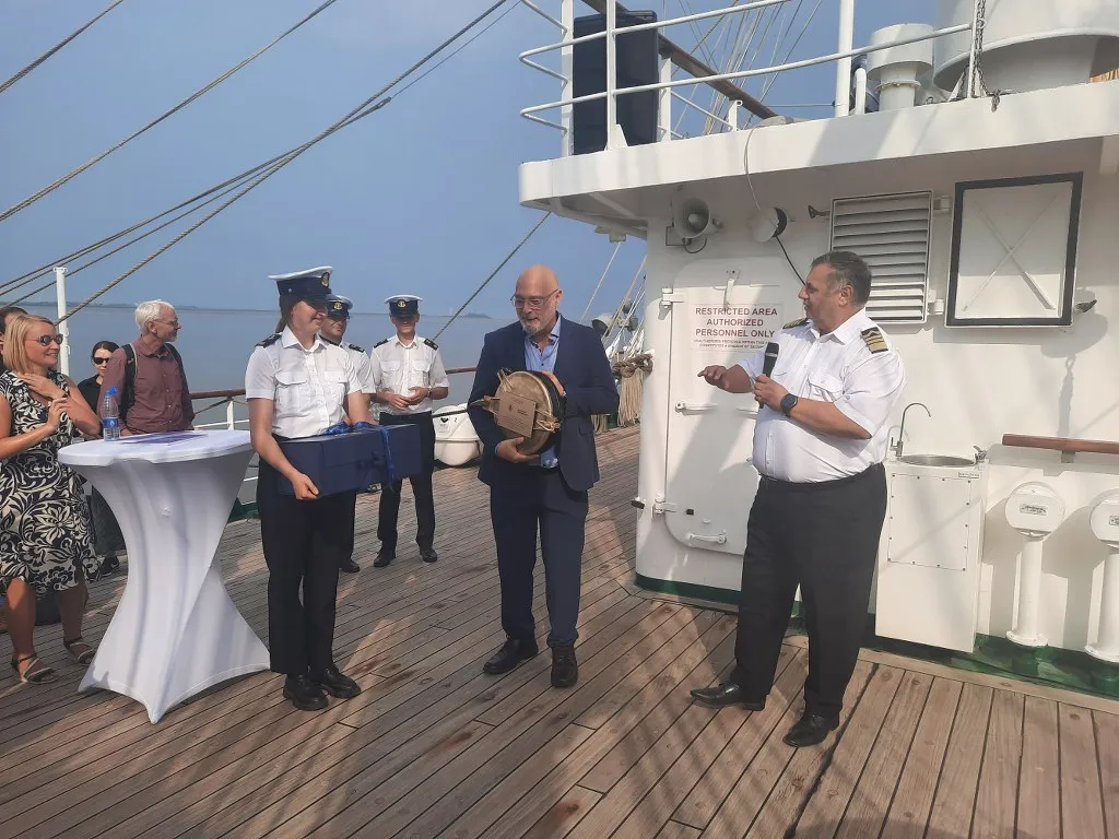 Następnie na ręce Rektora Hochschule Bremerhaven prof. Alexisa Papathanassisa JM Rektor prof. dr hab. inż. kpt. ż.w. Adam Weintrit na pamiątkę obchodów wręczył oryginalny bulaj z pokładu „Daru Młodzieży” oraz komplet porcelanowej zastawy według wzoru używanego na „Darze Młodzieży”.