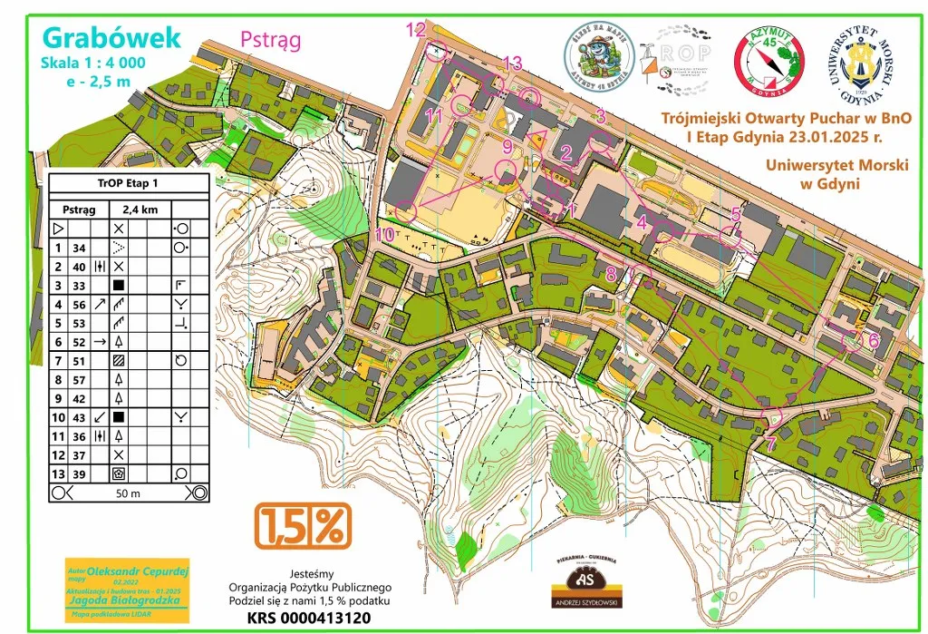 W czwartkowy wieczór, 23 stycznia 2025 r. w UMG odbył się inauguracyjny etap Trójmiejskiego Otwartego Pucharu w Biegu na Orientację (TrOP), który w bieżącym roku gości na terenie trójmiejskich uczelni wyższych oraz dzielnicach Gdyni i Gdańska (cykl 10 comiesięcznych zawodów). Oprócz wymiaru sportowego impreza, w której wzięło udział ok. 60 osób na 4 trasach o różnym poziomie trudności, miała także charakter popularyzacyjny. Najmłodsza uczestniczka miała 4 latka, a najstarszy zawodnik 71 lat.