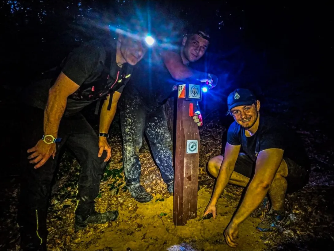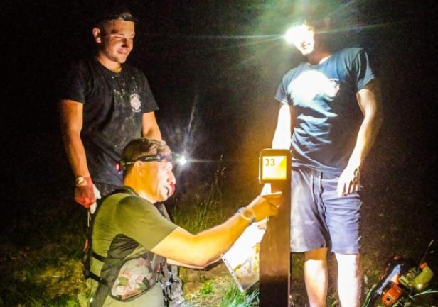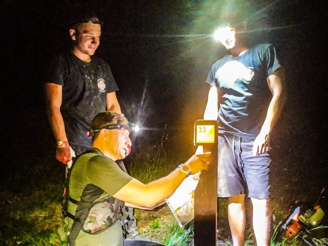Ostatnie punkty montowaliśmy już po zmroku, idąc z całym sprzętem i parami słupków spory dystans na piechotę. Na samym końcu został zainstalowany PK 39 (o godz. 22:45) zlokalizowany na górze, nieco na południe od funkcjonującej jednostki wojskowej na Grabówku. Jeszcze rano wydawało się, że czas niezbędny na montaż wszystkich punktów to przynajmniej 2-3 dni i to przy sprawnie zorganizowanej pracy zespołu. W celu jej usprawnienia bardzo pomocny okazał się szczegółowy rekonesans dróg, planowanych pozycji i terenu wokół każdego PK, przeprowadzony wcześniej przez Piotra Kopacza, a także przyjęta kolejność montażu poszczególnych PK. Na przyczepę załadowaliśmy także trochę śmieci napotkanych w kilku miejscach. Z lasu wyjechaliśmy o 23:20 zmęczeni, ale jednocześnie z uczuciem sporej satysfakcji z efektywnie wykonanej pracy oraz faktu, iż projekt stworzy dodatkową możliwość pozytywnego spędzenia czasu, nie mając przy tym charakteru komercyjnego. Z założenia ma on być ogólnie dostępny, w szczególności dla studentów UMG oraz mieszkańców Gdyni, Trójmiasta i Pomorza.