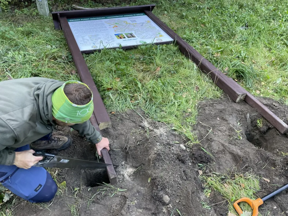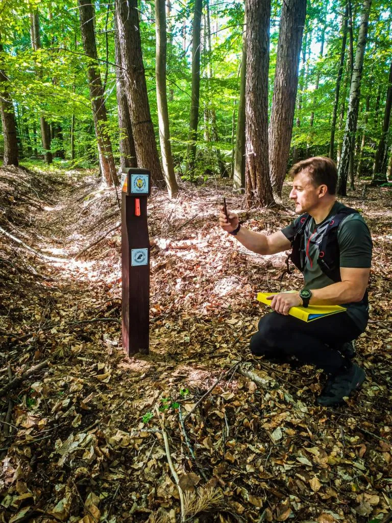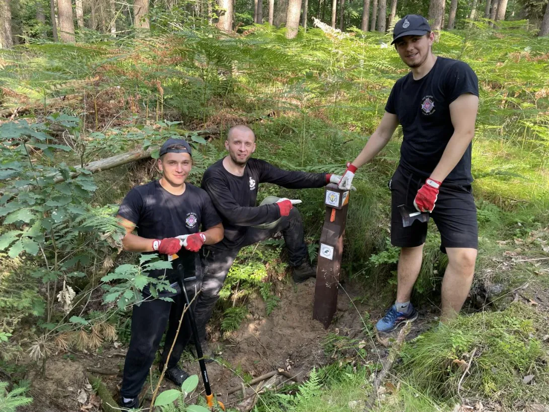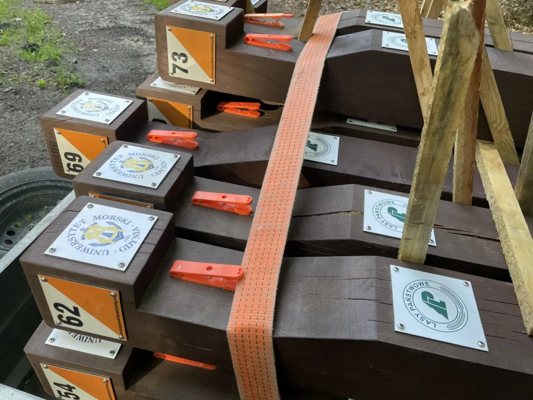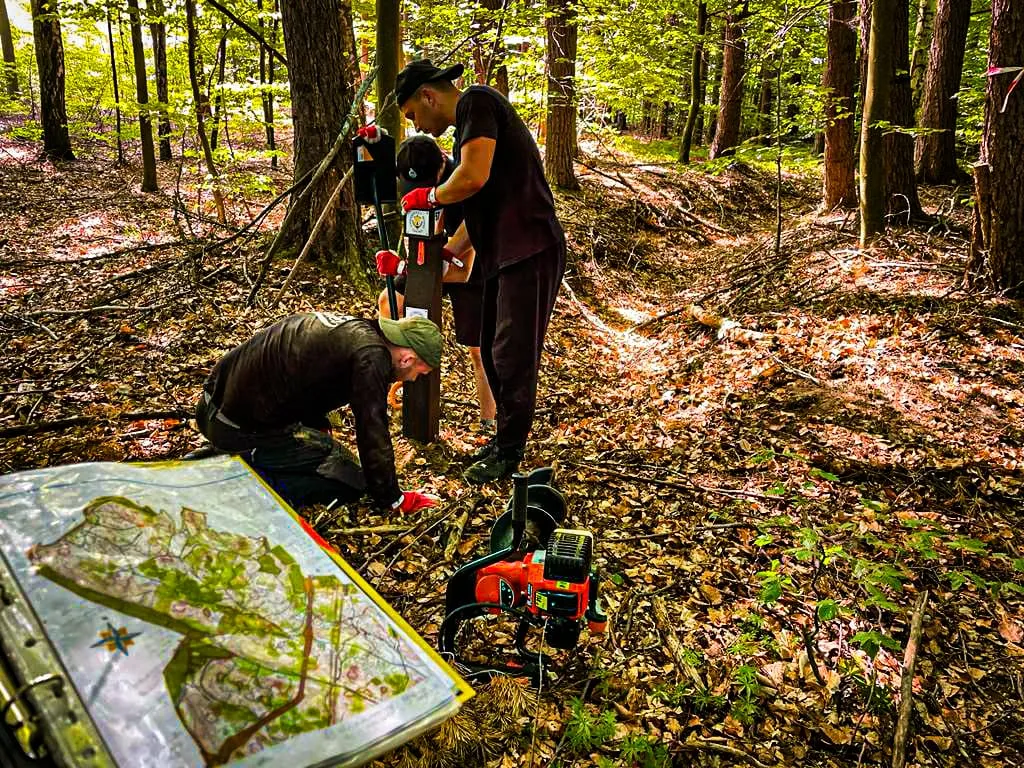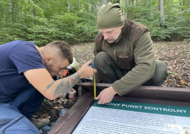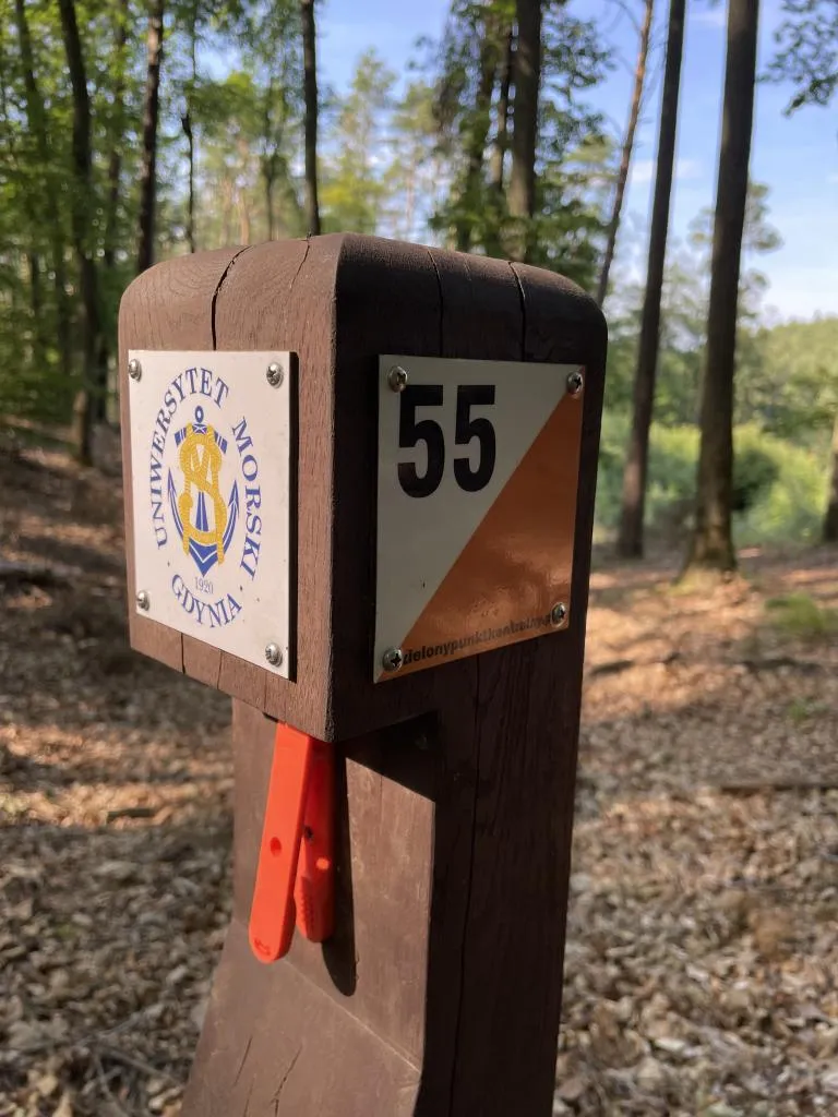 (...) Wszystkie 42 punkty kontrolne (PK) w formie dębowych słupków udało się nam "zasadzić" w terenie w jeden dzień. Była to upalna sobota 15.VII.2023r. Pierwszym zainstalowanym punktem kontrolnym był PK 45 w południowej i najbardziej płaskiej części obszaru ZPK-UMG. Mimo iż nie obyło się bez małych przygód na błotnistych leśnych drogach (m.in. konieczne były rozprzęgania przyczepy i wyciągania samochodu, który ugrzązł w paru miejscach) i intensywnej pracy, świetna atmosfera towarzyszyła nam przez cały dzień. "Grupa robocza" składała się z czterech osób: druhów Antka Dopke, Szymona Helanda, na czele z Kamilem Dopke z Ochotniczej Straży Pożarnej w Bojanie, którym należą się szczególne podziękowania za pomoc w montażu infrastruktury, oraz Piotra Kopacza z Wydziału Nawigacyjnego UMG - pomysłodawcę i koordynatora całego projektu. Warto wspomnieć, iż Kamil jest absolwentem Wydziału Mechanicznego UMG sprzed kilku lat.