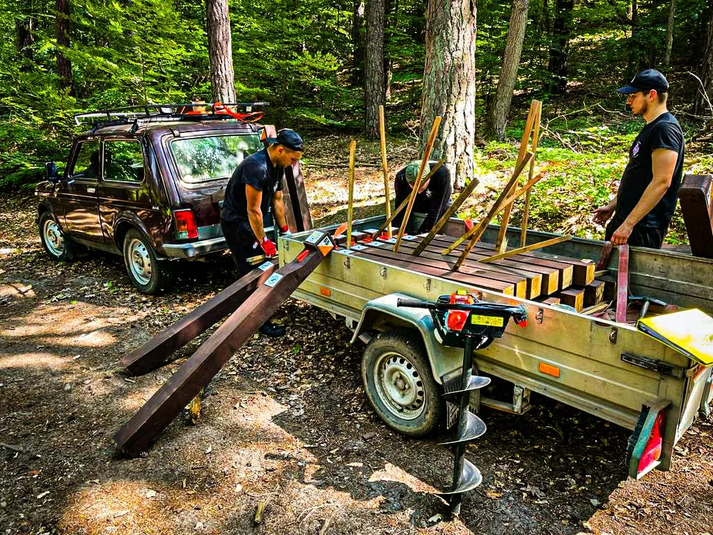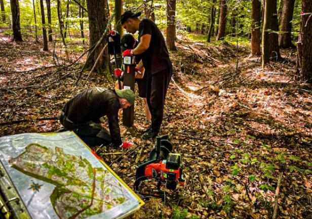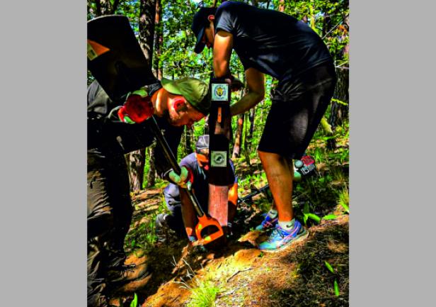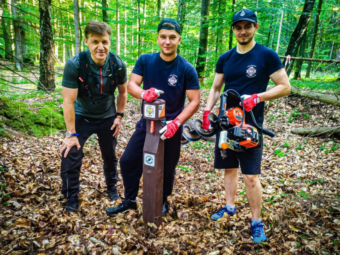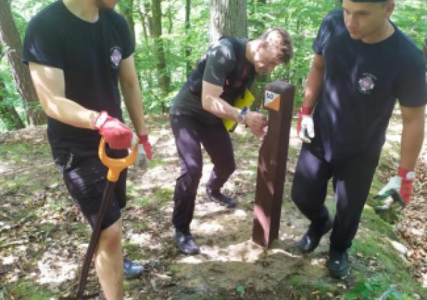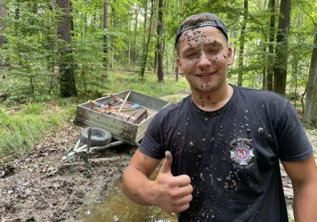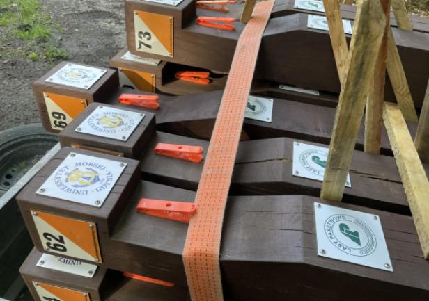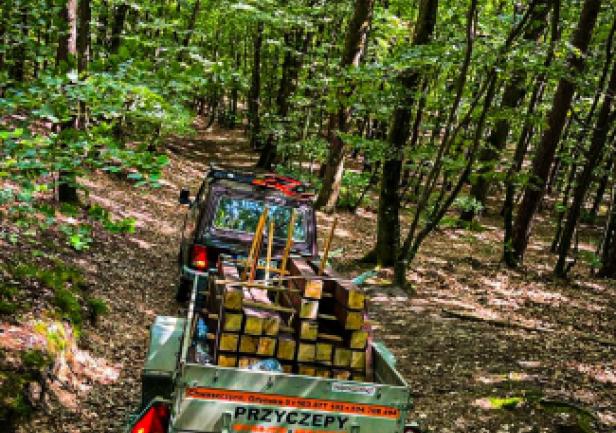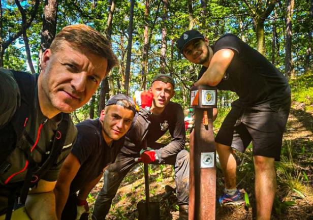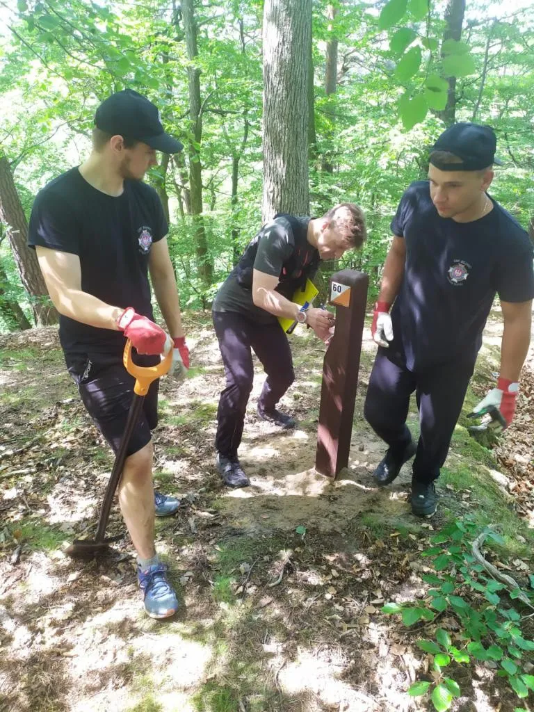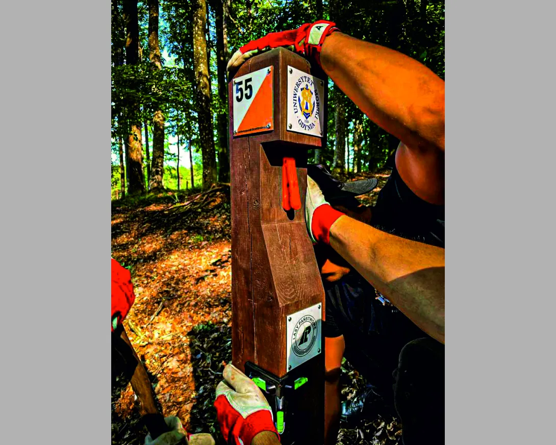 (...) Wszystkie 42 punkty kontrolne (PK) w formie dębowych słupków udało się nam "zasadzić" w terenie w jeden dzień. Była to upalna sobota 15.VII.2023r. Pierwszym zainstalowanym punktem kontrolnym był PK 45 w południowej i najbardziej płaskiej części obszaru ZPK-UMG. Mimo iż nie obyło się bez małych przygód na błotnistych leśnych drogach (m.in. konieczne były rozprzęgania przyczepy i wyciągania samochodu, który ugrzązł w paru miejscach) i intensywnej pracy, świetna atmosfera towarzyszyła nam przez cały dzień. "Grupa robocza" składała się z czterech osób: druhów Antka Dopke, Szymona Helanda, na czele z Kamilem Dopke z Ochotniczej Straży Pożarnej w Bojanie, którym należą się szczególne podziękowania za pomoc w montażu infrastruktury, oraz Piotra Kopacza z Wydziału Nawigacyjnego UMG - pomysłodawcę i koordynatora całego projektu. Warto wspomnieć, iż Kamil jest absolwentem Wydziału Mechanicznego UMG sprzed kilku lat.