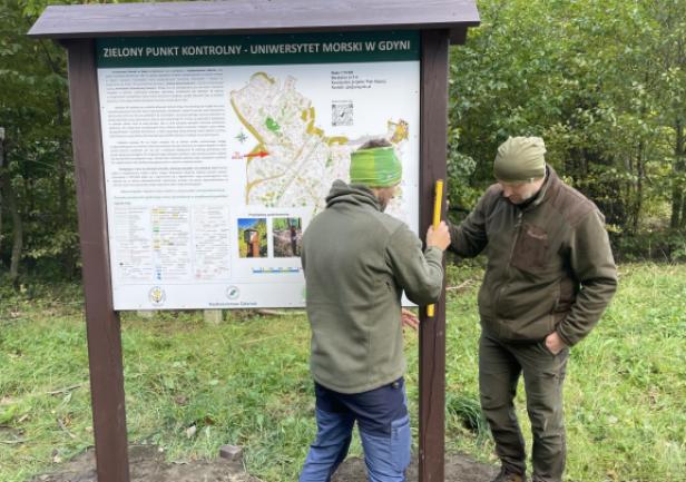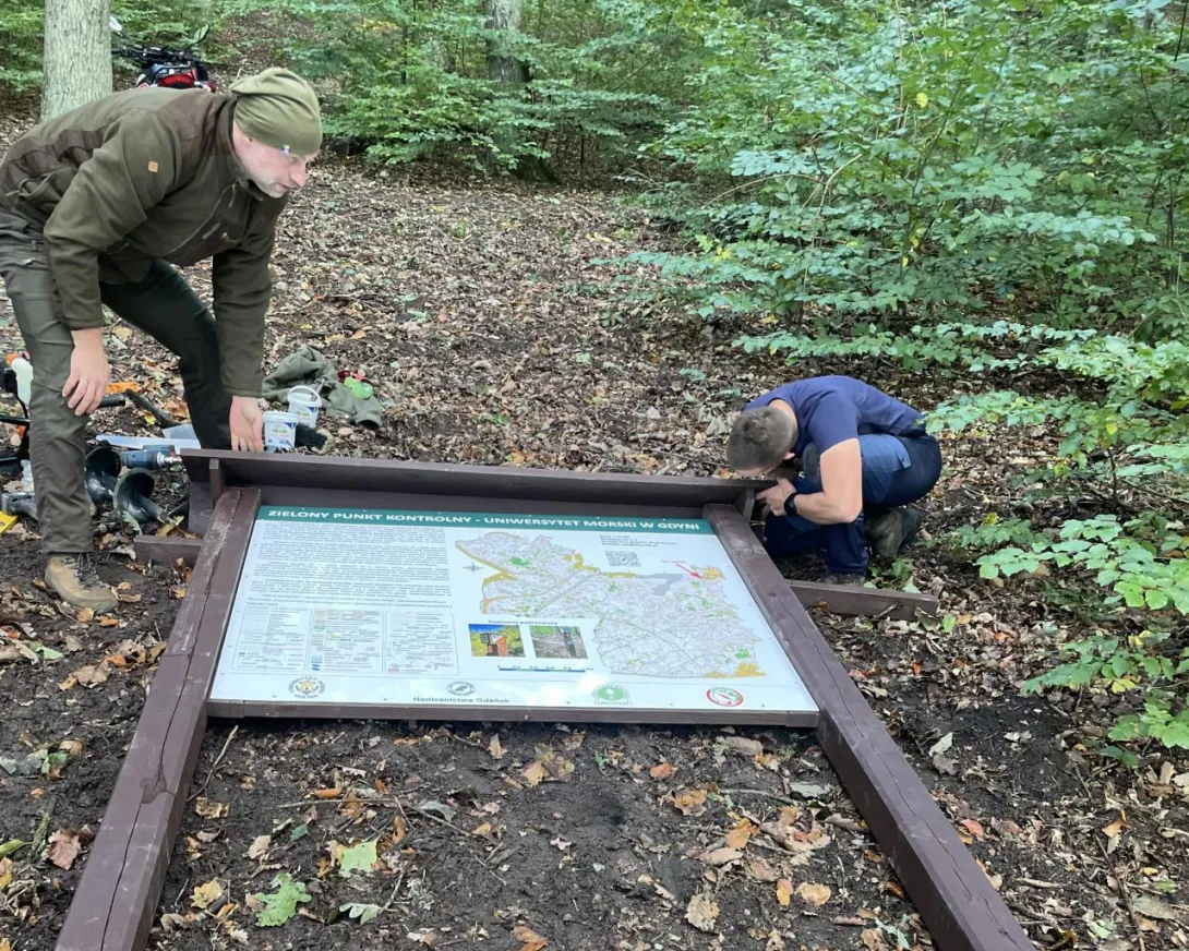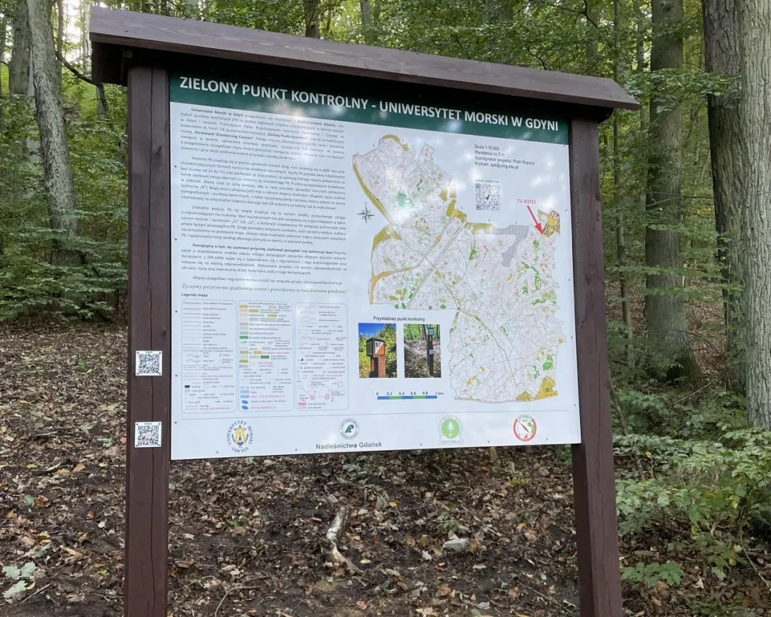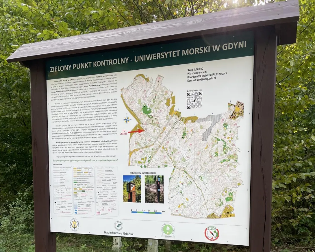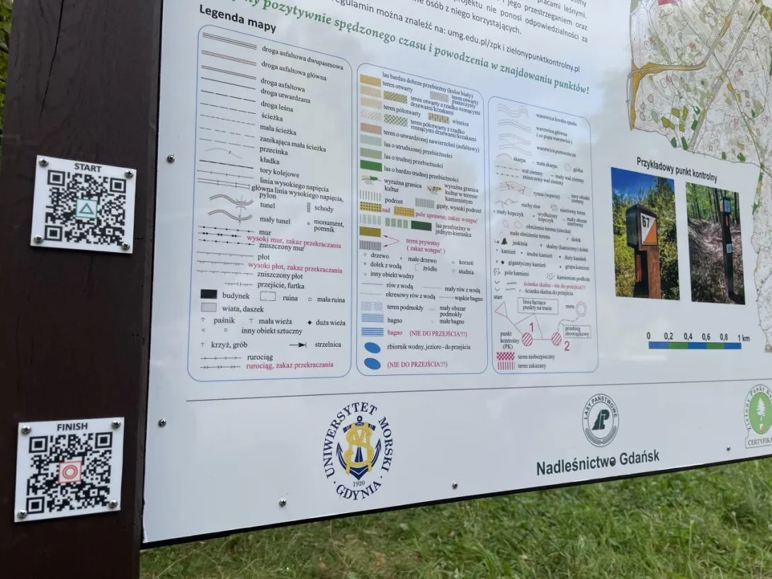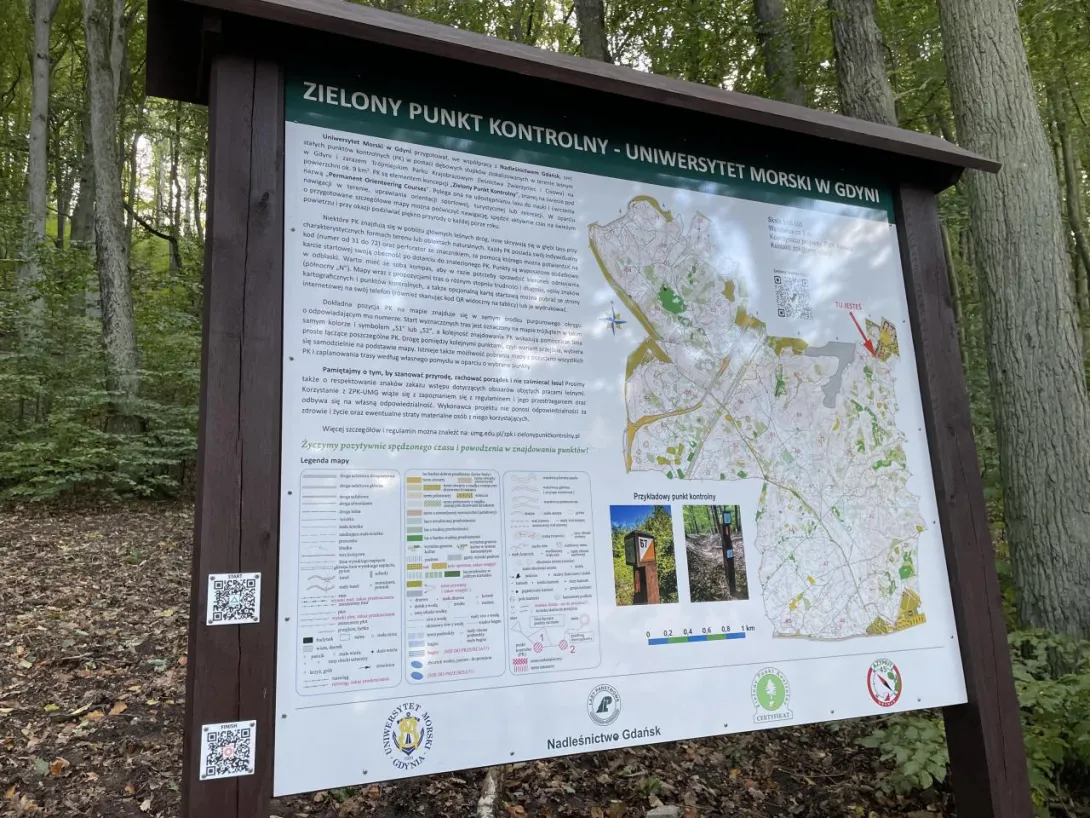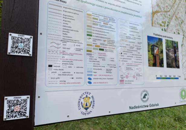 Tablice informacyjne zostały zamontowane w dniu 12.X.2023r. w miejscach wyznaczonych startów, tj. "S1" (dla mapy "Grabówek") i "S2" (dla mapy "Chylonia"). Praca ta została wykonana przez Kamila Dopke i Piotra Kopacza, przy wsparciu Piotra Pielenia - leśniczego z leśnictwa Zwierzyniec w Gdyni. W dniu 17.V.2024r. została także postawiona trzecia tablica wraz z dodatkowym PK 73, zlokalizowana na terenie kampusu UMG. Znajduje się ona tuż przy nowej nowej hali sportowej w Centrum Sportu i Rekreacji UMG. Warto także dodać, iż na tablicach informacyjnych, jak i każdym PK w terenie znajduje się kod QR (w prawym dolnym rogu biało-czerwonej tabliczki), co pozwala na alternatywne "zaliczanie" punktów poprzez skanowanie smartfonem i aplikację iOrienteering (instrukcja "krok po kroku" TUTAJ). Drugi, mniejszy kod QR (w prawym górnym rogu biało-czerwonej tabliczki PK) odsyła z kolei do niniejszej strony internetowej ZPK-UMG.