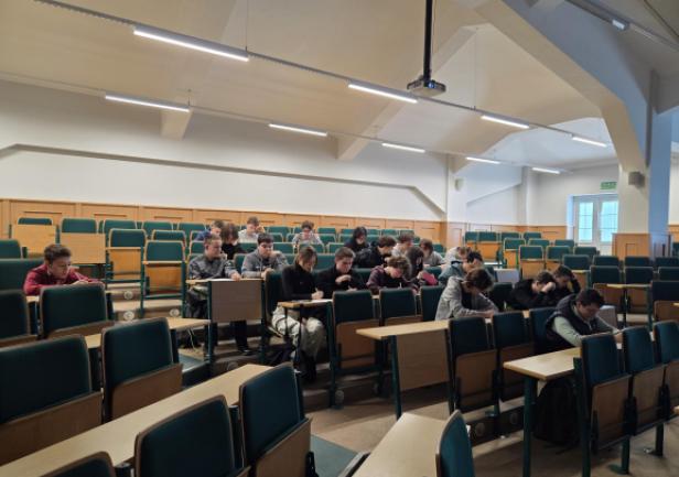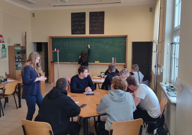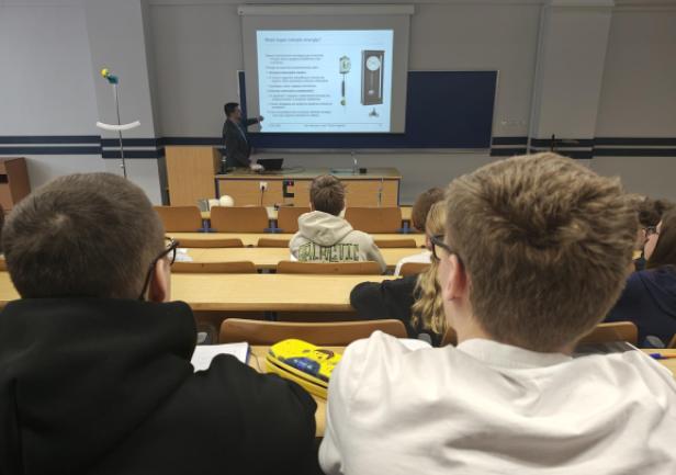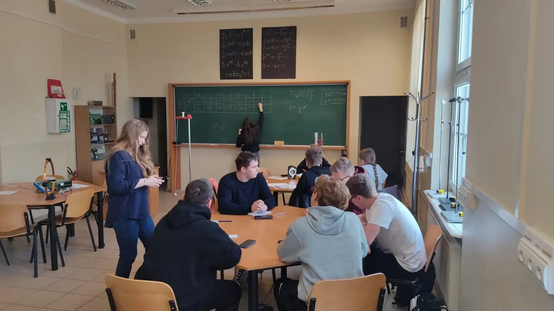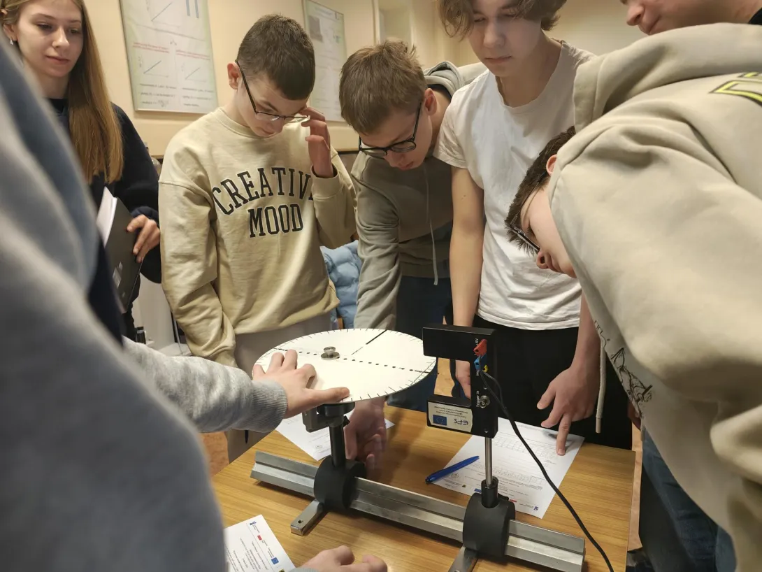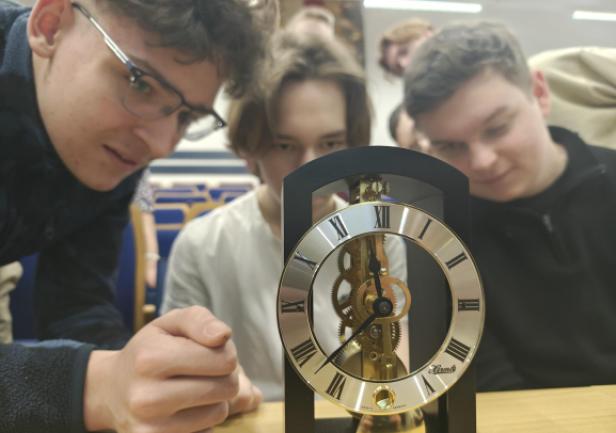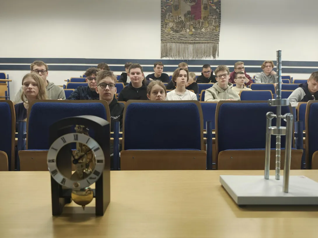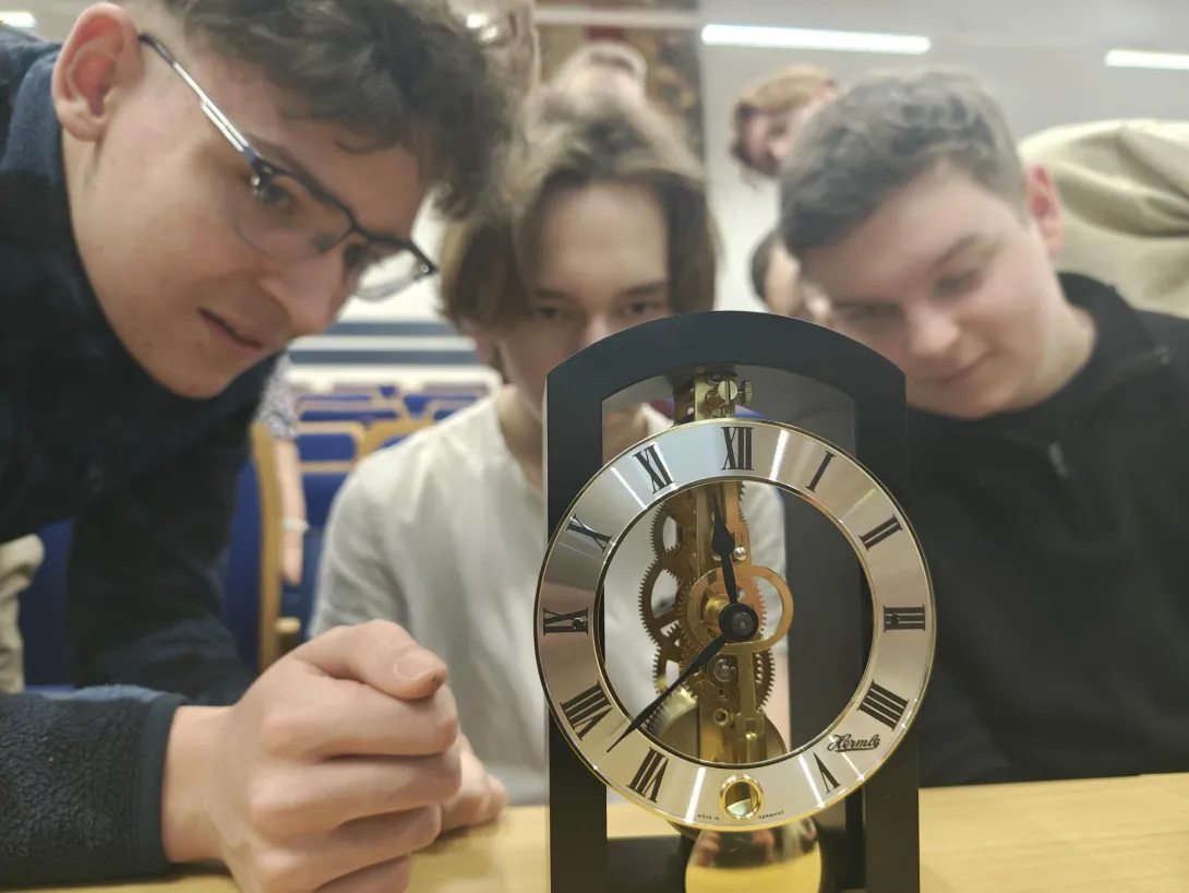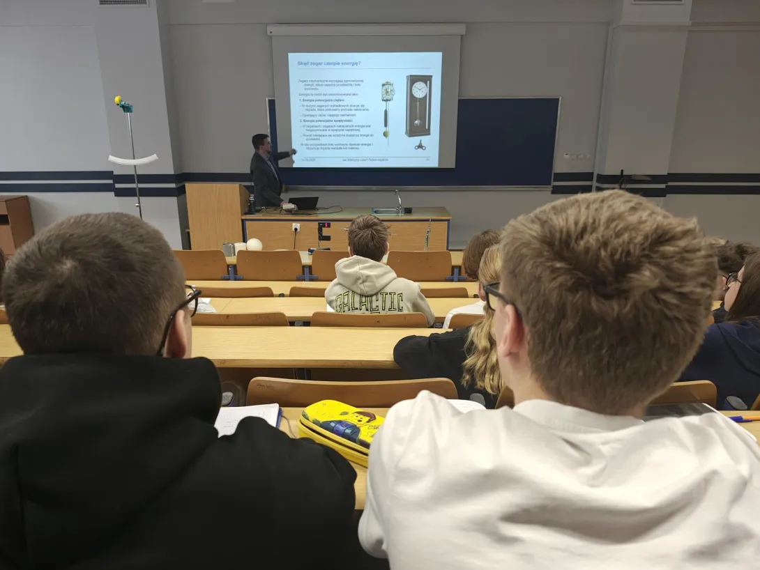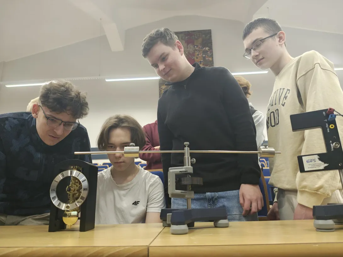 Na spotkaniu akademickim z fizyki pt. "Jak mierzymy czas? Fizyka zegarów mechanicznych, wahadłowych i z balansem skrętnym" uczniowie poznali historię zegarów mechanicznych, fizyczne podstawy ich działania i sposoby pomiaru czasu. W trakcie wykładu omówiono rolę układów drgających – wahadeł i balansów – które przez stulecia stanowiły podstawę dokładnych mechanizmów zegarowych. Zwrócono uwagę na zależność okresu drgań od długości wahadła, znaczenie grawitacji oraz ograniczenia, jakie prawa fizyki stawiają w dążeniu do coraz większej precyzji pomiaru czasu. W części warsztatowo-laboratoryjnej uczestnicy samodzielnie przeprowadzali pomiary okresu drgań wahadeł matematycznych, na podstawie których wyznaczali wartość przyspieszenia ziemskiego. Zajmowali się również analizą drgań wahadeł skrętnych, wykorzystując je do wyznaczania momentów bezwładności wybranych układów.