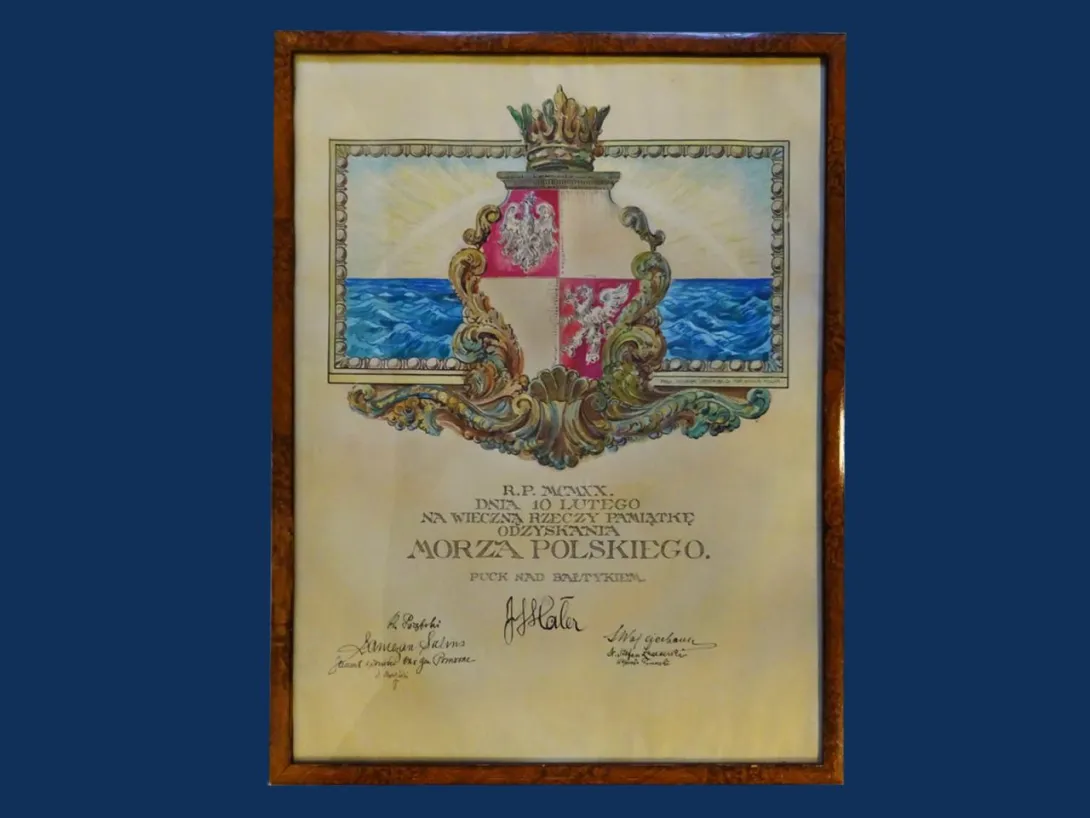 Akt zaślubin, którego oprawa plastyczna została wykonana krakowskiego artystę malarza Henryka Uziembłę, podpisali m.in. gen. Józef Haller, kadm. Kazimierz Porębski, gen. Robert Lamezan-Salins, minister Stanisław Wojciechowski, wojewoda pomorski Stefan Łaszewski.