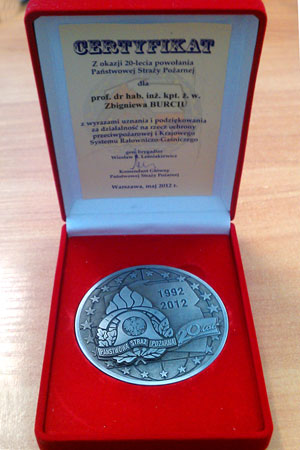 W dniu 25 maja 2012 r.  na VIII Seminarium Bezpieczeństwo w transporcie wodnym, zorganizowanym przez Katedrę Eksploatacji Statku, Z-ca Małopolskiego Komendanta Wojewódzkiego Państwowej Straży Pożarnej  st. brygadier Józef Galica wręczył dr hab.inż. kpt.żw. Zbigniewowi Burciu, prof. nadzw. AM, medal wydany z okazji 20-lecia powołanaia Państwowej Strazy Pożarnej. Medal ten został przyznany przez gen. brygadiera Wiesława Leśniakiewicza Komendanta Głównego Państwowej Straży Pożarnej z wyrazami uznania i podziękowania za działalność na rzecz ochrony przeciwpożarowej i Krajowego Systemu Ratowniczo-Gaśniczego.