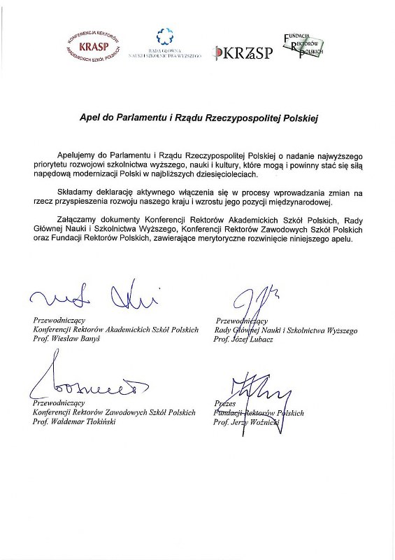 11 stycznia 2013r. na posiedzeniu Prezydium Konferencji Rektorów Akademickich Szkół Polskich przyjęto Apel do Parlamentu i Rządu Rzeczypospolitej Polskiej o nadanie najwyższego priorytetu rozwojowi szkolnictwa wyższego, nauki i kultury, którego sygnatariuszami są: Przewodniczący KRASP, Przewodniczący RGNiSW, Przewodniczący KRZaSP oraz Prezes FRP.