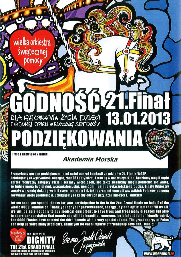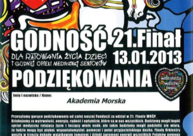 Akademia Morska w Gdyni otrzymała podziękowania od Fundacji Wielkiej Orkiestry Świątecznej Pomocy.