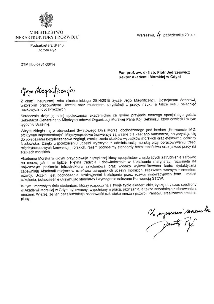 Z gratulacjami dla społeczności akademickiej wystąpili zaproszeni goście, m.in. Podsekretarz Stanu w Ministerstwie Infrastruktury i Rozwoju Pani prof. Dorota Pyć oraz rektor Hochschule Bremerhaven prof. Josef Stockemer. Głos zabrała także pełniąca obowiązki przewodniczącego Parlamentu Studentów AMG Weronika Żółkowska.