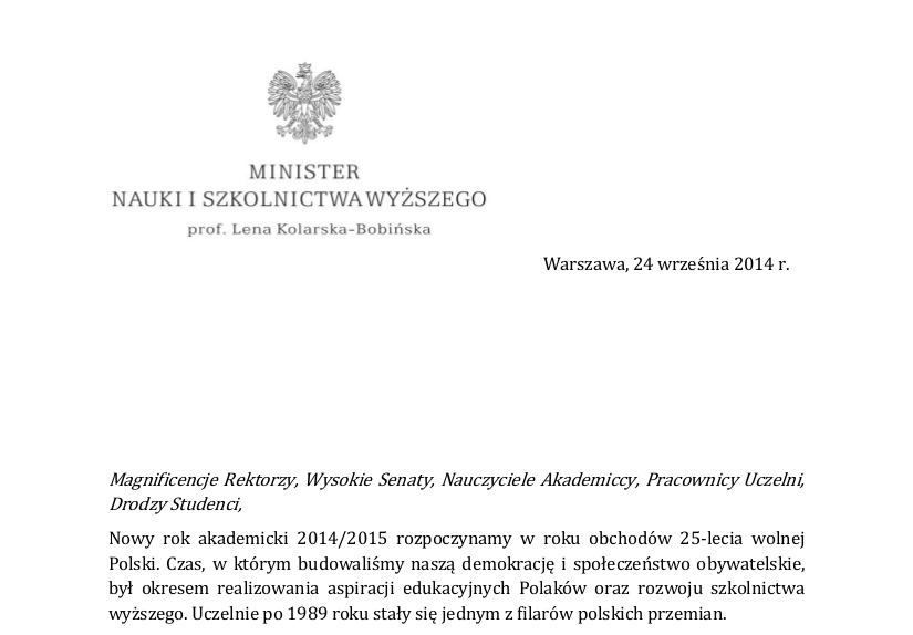 Z okazji inauguracji roku akademickiego 2014/2015 Minister Nauki i Szkolnictwa Wyższego Prof. Lena Kolarska-Bobińska przesłała list inauguracyjny skierowany do całej społeczności akademickiej.