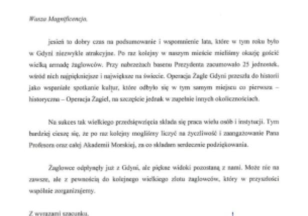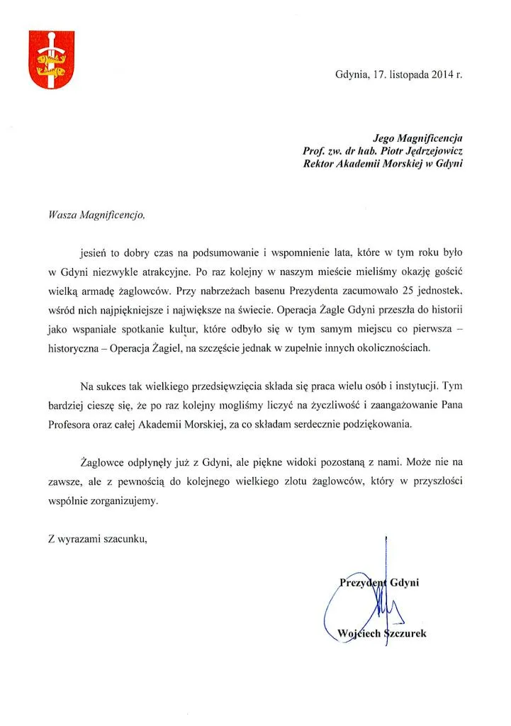 Na ręce JM Rektora prof. Piotra Jędrzejowicza wpłynął list z podziękowaniami od Prezydenta Gdyni Pana Wojciecha Szczurka za pomoc i współpracę przy tegorocznym zlocie żaglowców "Operacja Żagle Gdyni 2014”.