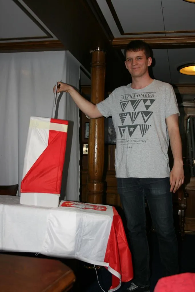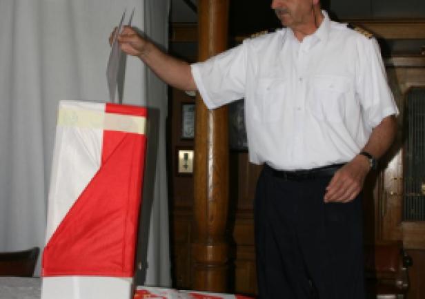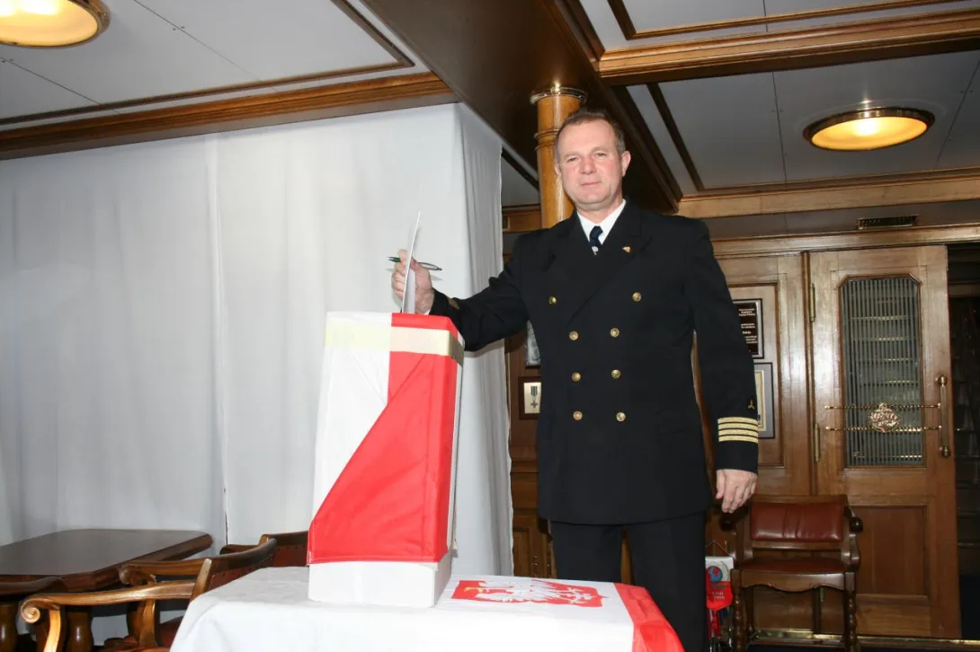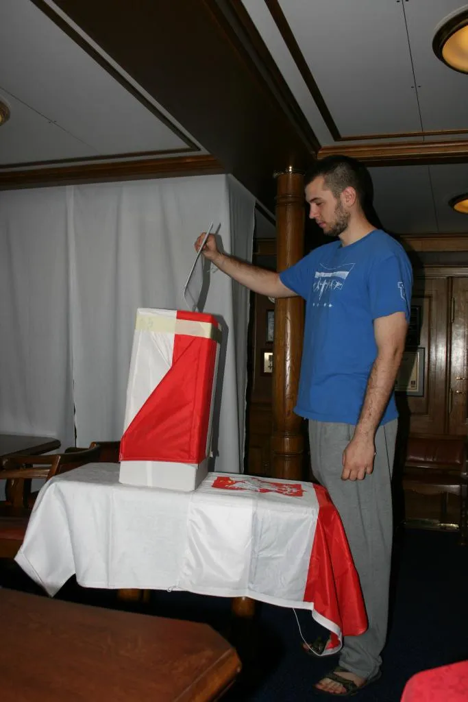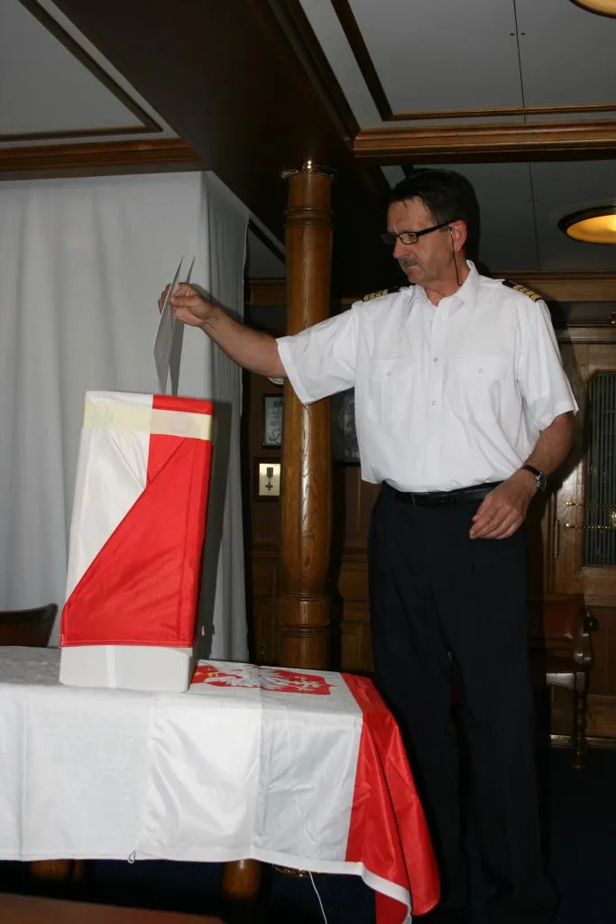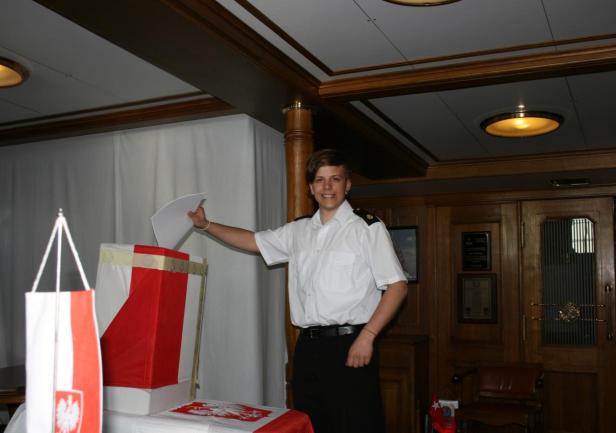 W niedzielę 25 maja, na znajdującym się na Bałtyku w ramach podróży szkoleniowej żaglowcu, powołana przez komendanta komisja wyborcza, rozpoczęła pracę w godzinach przewidzianych instrukcją. Szansę wypełnienia obywatelskiego obowiązku miało 126 członków załogi stałej oraz studentów Akademii Morskiej. Spośród uprawnionych do głosowania, skorzystało z niej 36 osób. Wpływ na niezbyt masowy udział, miał niewątpliwie obowiązek wcześniejszego zgłoszenia, w miejscu stałego zameldowania, chęci przystapieniu do wyborów w innym obwodzie. Poprzedzająca bezpośrednio rejs sesja egzaminacyjna, zaprzątała studentów problemami zupełnie innej natury.