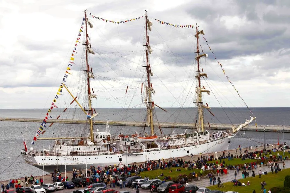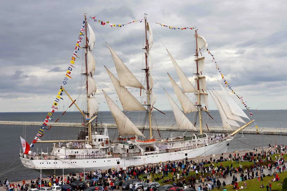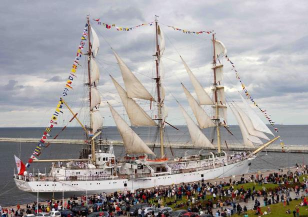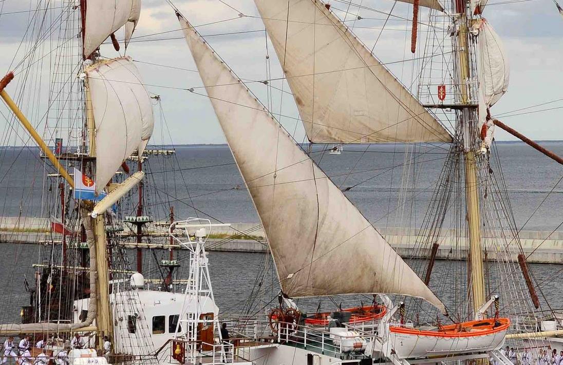 Dzień inauguracji gdyńskiego Święta Morza - sobota 21 czerwca, godz. 17.00. Na końcu Mola Południowego, przy burcie "Daru Młodzieży" liczna grupa zainteresowanych zapowiadanym pokazem stawiania żagli. Potrójny sygnał statkową syreną na przywitanie i żagle poszły w górę - kliwry, sztaksle, wreszcie rejowe. W sumie "Dar" postawił niemal wszystko - 22 żagle. Przez poprzedzające pokaz godziny, komendant i oficerowie nerwowo przeglądali prognozy i wskazania wiatromierzy. Nieprzyjemny wiatr od rufy, z gwałtownymi szkwałami budził niepokój. Na szczęście po 16.00 nieco się uspokoiło. Zrezygnowano jedynie z postawienia latacza, fokżagla, grotżagla i bezanżagla. Duże wrażenie zrobiło także sprzątanie żagli - kiedy załoga w białych drelichach poszła na maszty. Zaimprowizowana parada rejowa i pozdrowienia z góry przyjęto oklaskami. W sumie prawie 40 minut efektownego spotkania z żaglami.