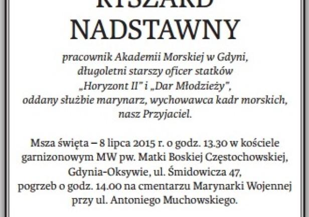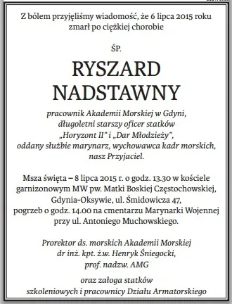 W środę 8 lipca towarzyszyliśmy w ostatniej drodze Ryszarda Nadstawnego. Dział Armatorski w komplecie, poprzedni kapitanowie "Horyzonta II", delegacja "Daru Młodzieży" z komendantem i pocztem sztandarowym wystawionym przez studentów II roku Wydziału Nawigacyjnego AMG odbywających praktykę na żaglowcu. Msza święta w kościele garnizonowym Marynarki Wojennej pw. Matki Boskiej Częstochowskiej w Gdyni-Oksywiu, celebrowana przez księdza kapelana Marynarki Wojennej, później przejazd na cmentarz garnizonowy Marynarki Wojennej - miejsce wiecznego spoczynku.