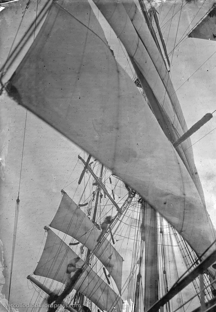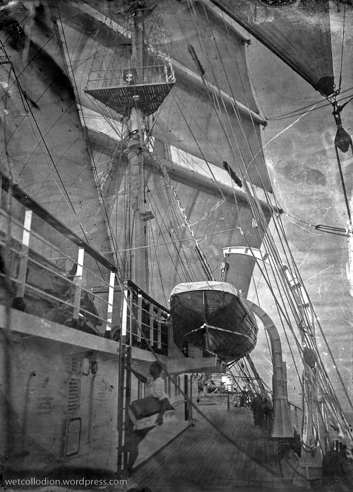 Pan Andrzej Górski musiał zatem zabrać na pokład, obok archaicznego aparatu ze statywem, przenośną ciemnię wraz ze wszystkimi niezbędnymi substancjami i osprzętem. Technika „mokrej płyty”, stosowana do uzyskiwania negatywów, dominowała w fotografii po roku 1850 przez ok. 30 lat. Dzięki wysokiej czułości daję możliwość odwzorowania najdrobniejszych szczegółów, jednak kilkusekundowe czasy naświetlania powodują, że fotografowane obiekty w ruchu – ludzie, przedmioty – tracą ostrość konturów. Gotowe czarno-białe fotogramy zachowują natomiast niepowtarzalną plastykę i urok artystycznych grafik.