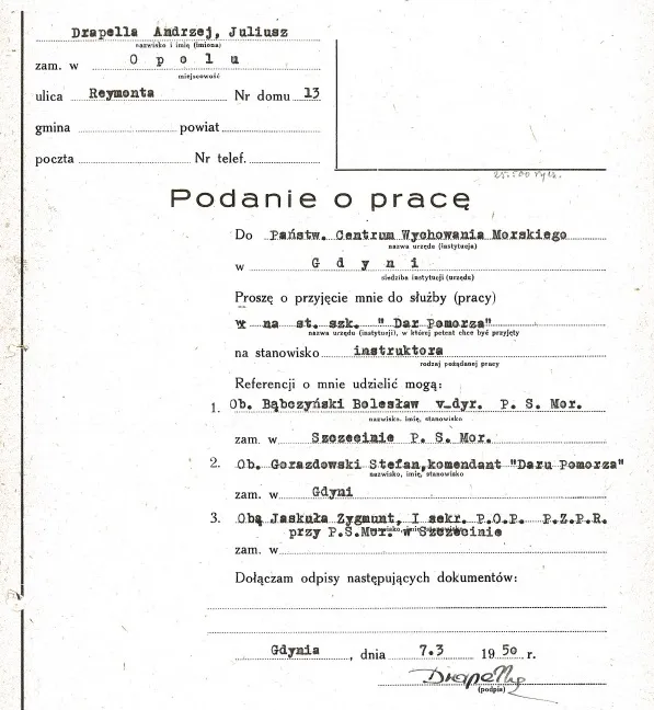 W marcu 1950 roku przyjęty został w charakterze instruktora na „Dar Pomorza”, a referencji udzielił mu m.in. komendant żaglowca kpt.ż.w. Stefan Gorazdowski.