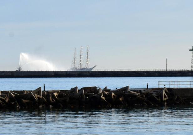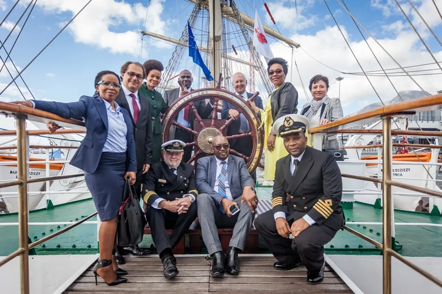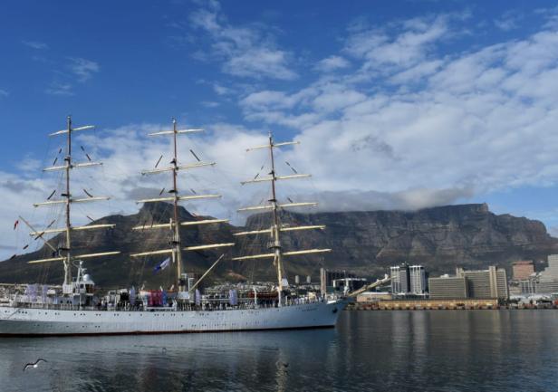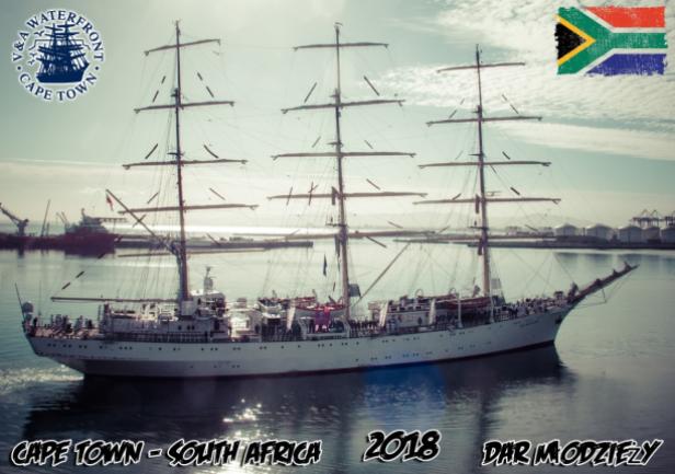 15.08. - Kapsztad powitał nas pięknym słońcem i widokiem Góry Stołowej przykrytej malowniczym obrusem z chmur. Na powitanie wyszedł nam holownik wyposażony w dwie armatki wodne, z których sikał na wiwat wprowadzając nas z honorami do portu. Splendoru dodała jeszcze orkiestra wojskowa, grająca melodię łudząco podobną do ścieżki dźwiękowej z "Pingwinów na Madagaskarze". Wśród witających znajdował się Minister gospodarki morskiej i żeglugi śródlądowej Marek Gróbarczyk i ambasador RP w Pretorii Andrzej Kanthak. Podczas postoju studenci i laureaci konkursu zwiedzali miasto, a także odwiedzili statek szkolny należący do szkoły technicznej w Kapsztadzie. Miasto zgodnie uznaliśmy za przepiękne, na co największy wpływ ma malownicze położenie: pomiędzy Górą Stołową, Lwią Głową i Wzgórzem Sygnałowym. Miejsce postoju "Daru" również należało do malowniczych. Była to prestiżowa dzielnica miasta - Waterfront, stanowiąca luksusową zabudowę dawnych terenów portowych.