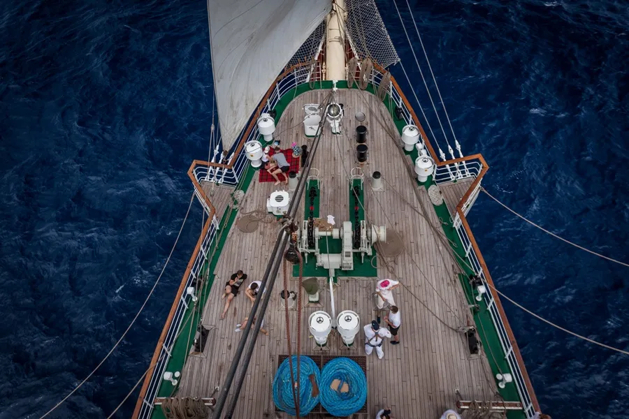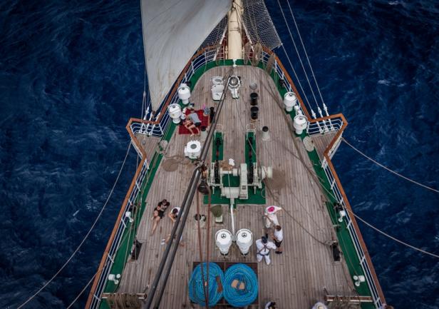 1.07. - wyjściem z Bordeaux żegnamy na 9 miesięcy kontynent europejski. Młodzi żeglarze nie mogą narzekać na nudę czy rutynę. Już drugiego dnia mogliśmy odstawić maszynę i idziemy na żaglach. Zorganizowaliśmy międzywachtowe zawody w sprzątaniu i stawianiu żagli rejowych. Włożyli w rywalizację mnóstwo serca, walka była zażarta, najlepszy wynik osiągnęła wachta III.