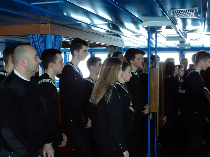 "W poniedziałek 26-go o godz.14:30 pod burtą sbs "Horyzont II" zameldowało się 40 praktykantów (w tym 8 pań) z opiekunem panem Tomaszem Paćko. Wszyscy są uczniami 3-go roku Zachodniopomorskiego Centrum Edukacji Morskiej i Politechnicznej ze Szczecina - wydziały nawigacyjny i mechaniczny. Witając ich na pokładzie, poinformowałem o zasadach odbywania praktyk i wymaganiach stawianych przez armatora statku, nawiązując także do swojej praktyki na morzu.