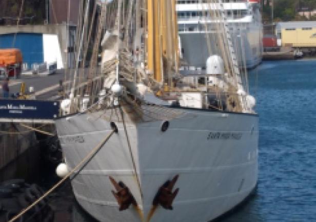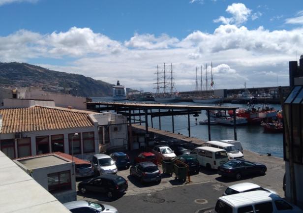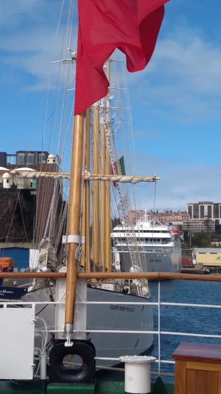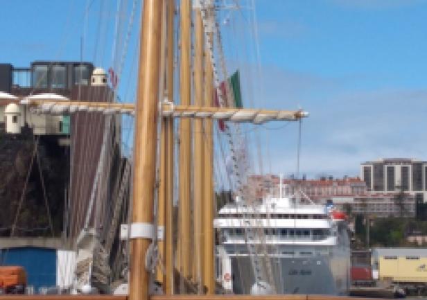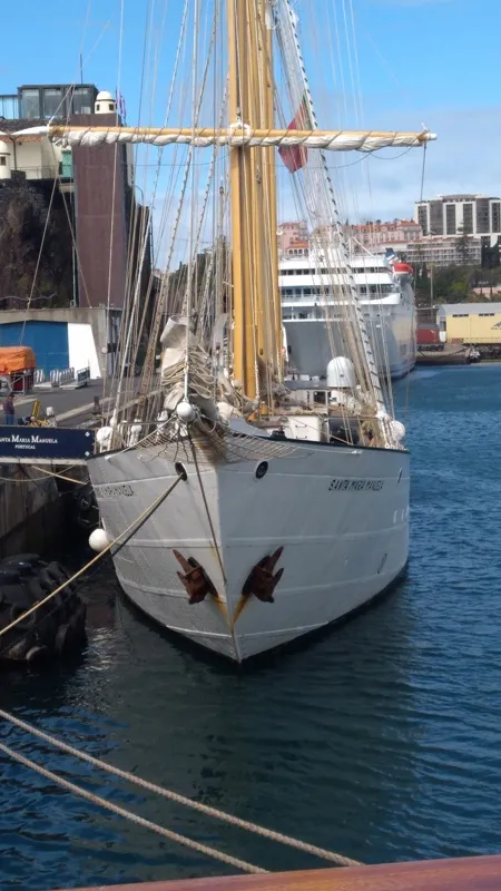 "Dar Młodzieży" zameldował się w Funchal 6 kwietnia o godz. 7.19 czasu lokalnego (6.19 UTC). Za rufą naszego żaglowca cumuje piękny, zabytkowy 4-masztowy szkuner portugalski "Santa Maria Manuela". Zbudowany w 1937 roku jako statek rybacki, w 2010 roku gruntownie zrewitalizowany, jest częstym gościem zlotów żaglowców. Podziwialiśmy go podczas rocznicowego zlotu Operacja Żagle Gdyni 2014, w sierpniu ubiegłego roku odwiedził Szczecin w ramach The Tall Ships Races. Komendant Lewandowski, w piątkowe popołudnie, gościł na "Darze" zaprzyjaźnionego komendanta portugalskiej "Marii Manueli".