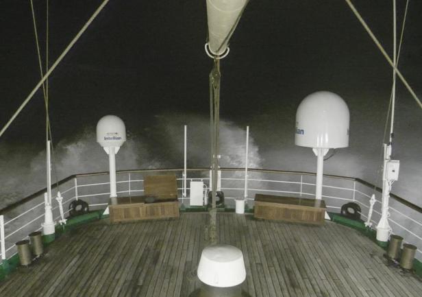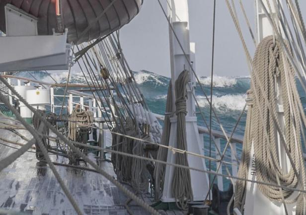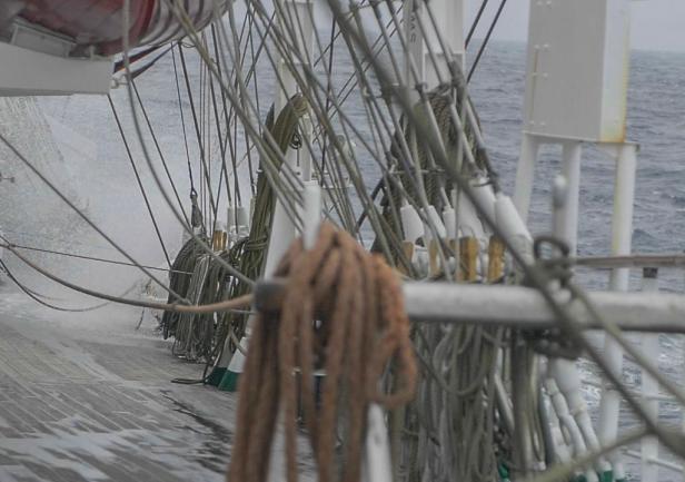 Wczoraj popołudniu ruszyliśmy w stronę Oceanu. Prognoza była pomyślna wiatr do 35 węzłów, słabnący do 26 węzłów. Okazało się jednak, że wieje dużo mocniej, nawet powyżej 60 w. Noc nie była spokojna. Niestety nasz forsztaksel nie wytrzymał próby. Urwał się blok szotów i żagiel się podarł. Wachta III zareagowała błyskawicznie i sprzątnęła żagiel zapobiegając większym uszkodzeniom. Od wczesnych godzin rannych wiatr osłabł, ale wieje dokładnie z kierunku w jakim mamy płynąć, więc pozostaje nam jazda na silniku.