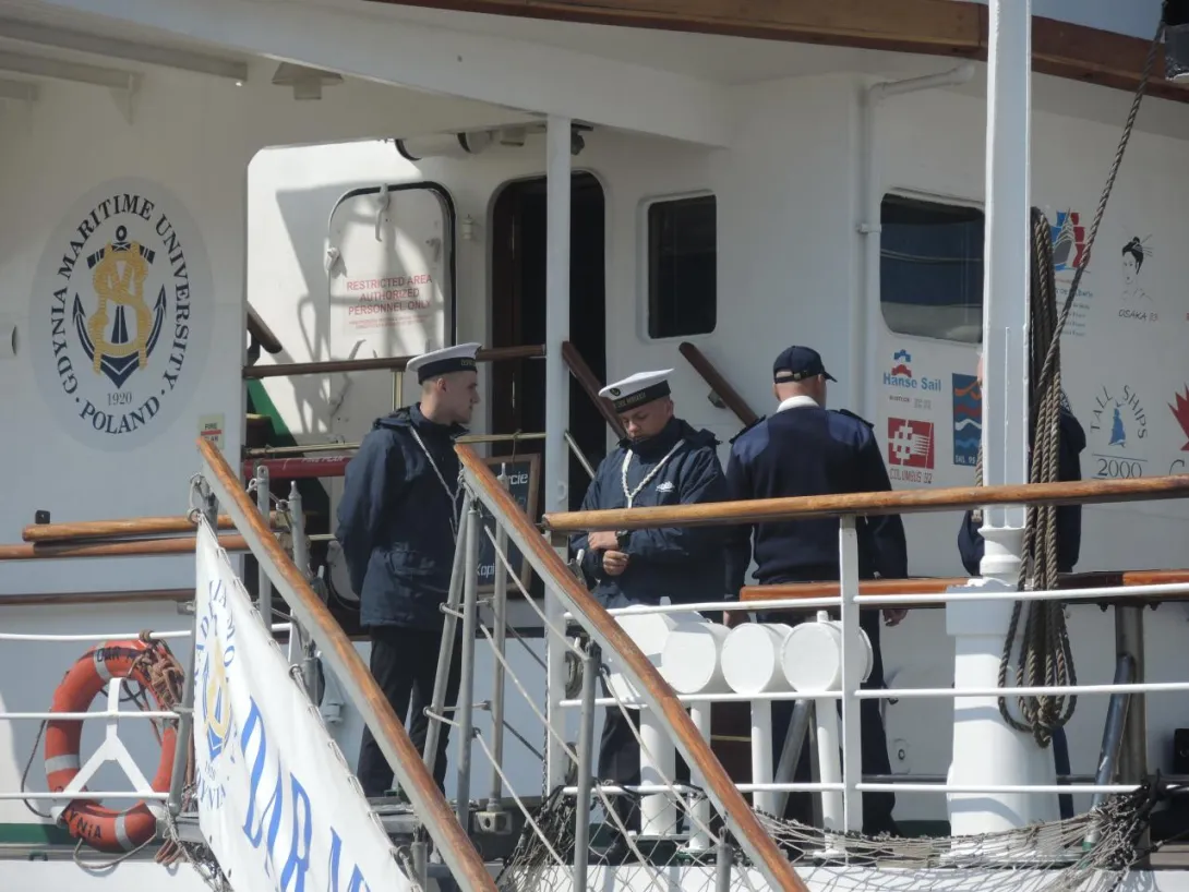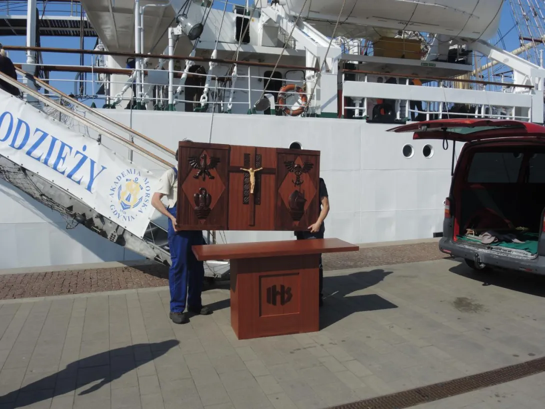 Obserwacja spod trapu: z furgonetki AMG wyłonił się niecodzienny ładunek. Monogram IHS i wszystko jasne - to mensa i nastawa ołtarza polowego, przy którym odprawiona zostanie w dniu wyjścia "Daru" msza święta. Ołtarz wyjątkowy - ufundowany na "Dar Pomorza" - od 1930 stanowił wyposażenie "białej fregaty". Wraz z wybitnym kapelanem ks. Wojciechem Kossak Główczewskim opłynął świat w latach 1934/1935, był na Hornie w 1937 roku. Po wojnie w 1949 roku skazany na zniszczenie, dzięki dzielnym ludziom ocalony, czas PRL-u przetrwał, w piwnicy na opał, prywatnym mieszkaniu, później w kościele pw. Świętej Rodziny na Grabówku. Zwrócony po zmianie ustroju Szkole, przekazany został następnie Centralnemu Muzeum Morskiemu - wrócił na pierwotne miejsce, do międzypokładu "Daru Pomorza". Na polecenie ówczesnego rektora, profesora Józefa Lisowskiego sporządzono wierną replikę - i to ona podjechała właśnie na "Dar". Na codzień stanowi wyposażenie kaplicy w Akademii Morskiej. Tyle w skrócie.