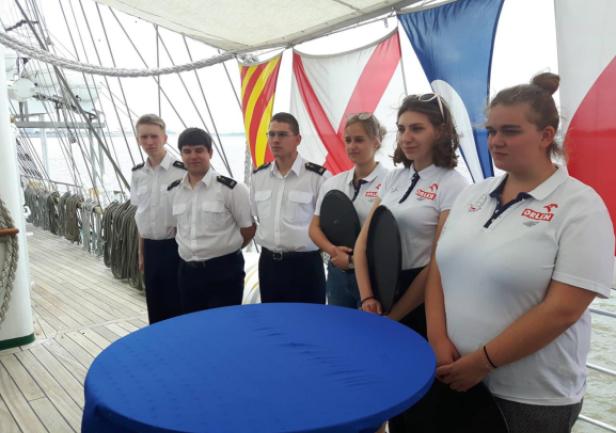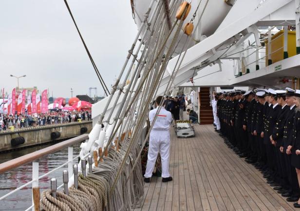 Oficjalnym punktem pobytu w Bremerhaven była wizyta na pokładzie wiceministra Gospodarki Morskiej i Żeglugi Śródlądowej Grzegorza Witkowskiego. Uczestniczył w spotkaniu z władzami zaprzyjaźnionej z AMG miejscowej Hochschule Bremerhaven z rektorem profesorem Peterem Ritzenhoffem. Gości podejmowali komendant kpt.ż.w. Ireneusz Lewandowski oraz prorektor ds. morskich AMG, dr hab. inż. kpt.ż.w. Henryk Śniegocki. Kontakty naukowe i dydaktyczne obu uczelni liczą już sobie 40 lat. Pierwsza wizyta w Bremerhaven naszego żaglowca - fregaty "Dar Pomorza" - miała miejsce w 1977 roku.