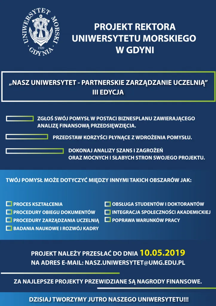 W tym roku, w ramach III edycji projektu Rektora Uniwersytetu Morskiego w Gdyni „Nasz Uniwersytet – Partnerskie Zarządzanie Uczelnią” przyjmowane są tylko i wyłącznie projekty w postaci biznesplanu zawierającego między innymi: