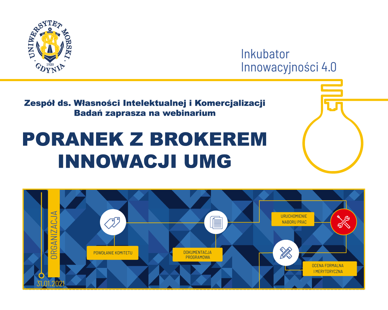 Celem wsparcia zespołów badawczych z UMG w aplikowaniu o środki na realizacje prac przedwdrożeniowych oraz podniesieniu gotowości technologicznej innowacyjnych rozwiązań w dn. 2.12.2020 r. o godzinie 10:00 odbędzie się spotkanie on-line pn. „Poranek z Brokerem Innowacji”.