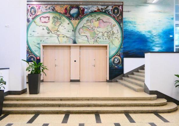 Mural, który zdobi ścianę budynku Wydziału Nawigacyjnego jest artystyczną formą pokazania Mapy Świata. Autorka dzieła, Joanna Rogowska inspirację czerpała z mapy świata opracowanej w 1630 roku przez Hendrika Hondiusa, opublikowanej rok później w atlasie Atlantis Marioris Appendix.