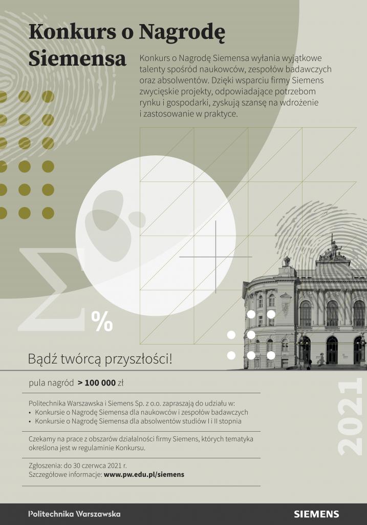 • Rusza nabór zgłoszeń do 26. edycji Nagrody Naukowej Siemensa, konkursu organizowanego przez firmę Siemens Polska wspólnie z Politechniką Warszawską.