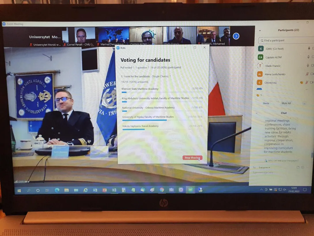 Spotkanie i wybory odbyły się 23 lutego 2022 roku w trybie online. Poprowadził je JM Rektor UMG prof. dr hab. inż. kpt. ż.w. Adam Weintrit oraz pełnomocnik rektora ds. IAMU - dr hab. Adam Przybyłowski, prof. UMG.