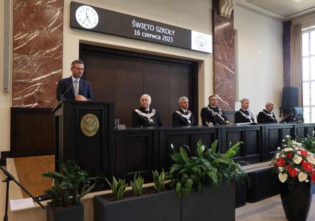 Swoje wystąpienie Minister Witkowski zakończył gratulacjami i wyrazami uznania przekazanymi JM Rektorowi Uniwersytetu oraz całej kadrze naukowo-dydaktycznej Uczelni za oddanie swojej pracy, poświęcenie oraz zaangażowanie wkładane w realizację wyznaczonych celów oraz innowacyjne podejście do potrzeb studiującej w Uczelni młodzieży.