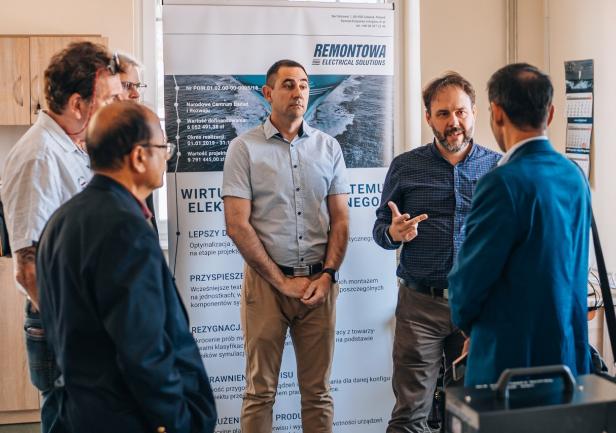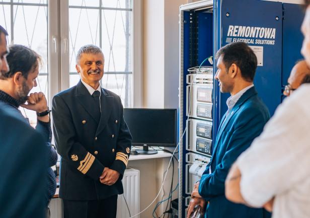 W ramach spotkania zaprezentowano laboratoryjne stanowisko z wirtualnym modelem systemu elektroenergetycznego statku zbudowane z wykorzystaniem technologii Hardware in the loop (HIL) w środowisku Typhoon Hil. Stanowisko zostało wykonane przez pracowników UMG, w kooperacji ze stocznią Remontowa Electrical Solutions w ramach projektu NCBiR nr POIR 01.02.00-00-005/1800 pt. „Zintegrowany system modelowania oraz graficznego projektowania instalacji elektrycznych na statkach”. Gościom przedstawiono wypracowane przez UMG (w kooperacji z RES) rozwiązanie i zademonstrowano pracę wirtualnego modelu okrętowego systemu elektroenergetycznego statku współpracującego z rzeczywistymi urządzeniami PMS (Power Management System) firmy Deif, powszechnie stosowanymi w technice okrętowej.
