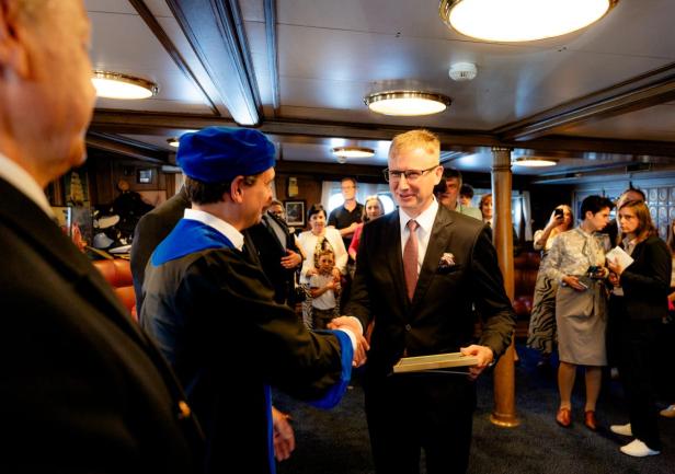 Absolwentów powitał i złożył im gratulacje również Pan Prorektor ds. Studenckich i Kształcenia dr hab. Sambor Guze, prof. UMG, który w trakcie uroczystości podkreślił, że odebrany dyplom oznacza także swego rodzaju zobowiązanie, a absolwenci kierunku od dzisiaj są ambasadorami nie tylko Uniwersytetu Morskiego w Gdyni, ale także Polski, a nabyta przez nich wiedza oraz umiejętności w toku studiów, powinny zostać wykorzystane tak, by przysłużyły się one społeczeństwu.