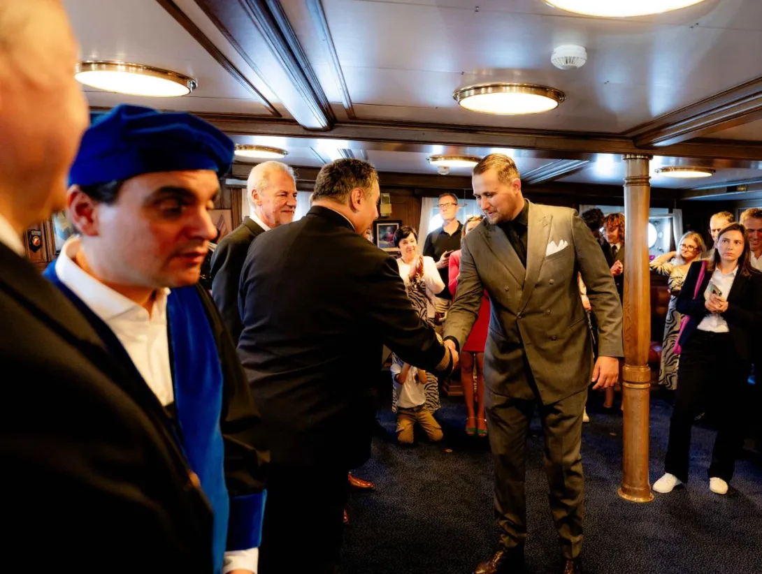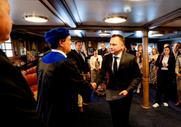 W trakcie uroczystości głos zabrał również przedstawiciel Uczelni będącej partnerem studiów Pan prof. Dominic Kudlacek z Hochschule Bremerhaven, który w swojej wypowiedzi skierowanej do absolwentów podkreślił z kolei, że w trakcie studiów obok wiedzy z zakresu pozyskiwania energii z odnawialnych źródeł nabyli między innymi umiejętność tworzenia innowacyjnych rozwiązań i poszukiwania nowych technologii, co w przyszłości pozwoli uniezależnić się od pozyskiwania energii z paliw kopalnych i wpłynie na dalszy rozwój i napędzanie gospodarki. Z kolei Pan Jakub Budzyński Wiceprezes Zarządu Polskiego Towarzystwa Morskiej Energetyki Wiatrowej, będący wykładowcą na kierunku, zwracając się do absolwentów podkreślił wyjątkowość programu studiów podyplomowych Executive Offshore Wind MBA, przypominając, że jego stworzenie było odważnym i nowatorskim przedsięwzięciem, ponieważ do roku 2020 program Offshore Wind Energy MBA nie był realizowany w kraju, a na świecie był prowadzony wyłącznie przez dwie Uczelnie - Hochschule Bremerhaven (Niemcy) oraz Business Academy SouthWest (Dania).