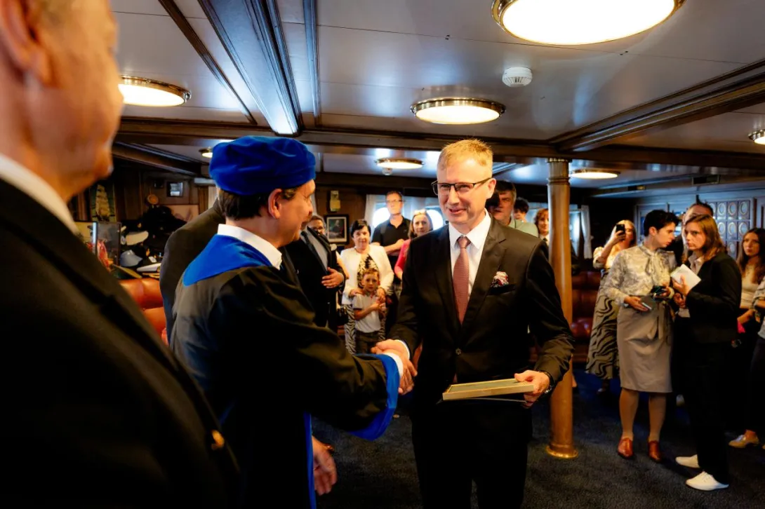 Podziękowania na ręce wykładowców oraz władz Uczelni w imieniu studentów Executive Offshore Wind MBA podczas uroczystości złożył ich absolwent, Piotr Żeglarski.