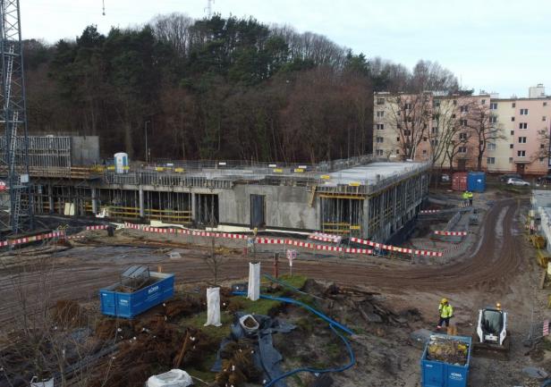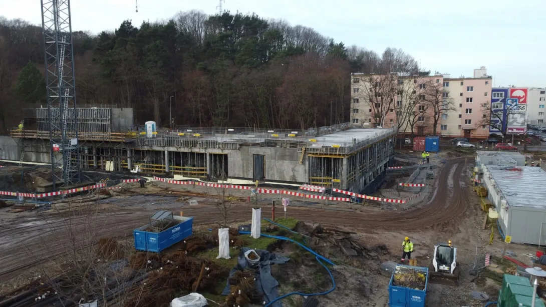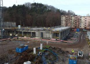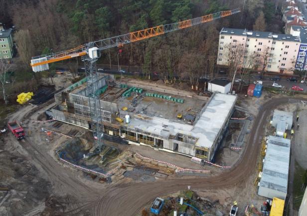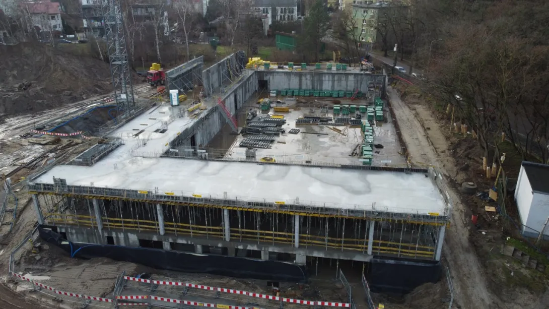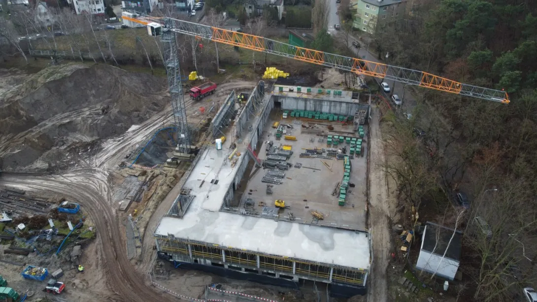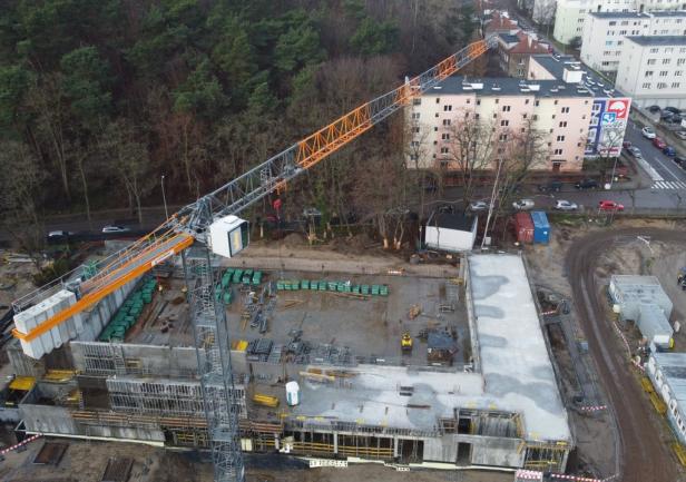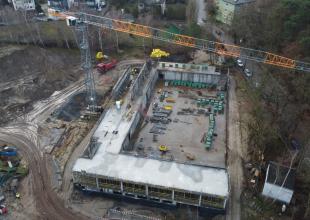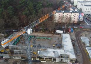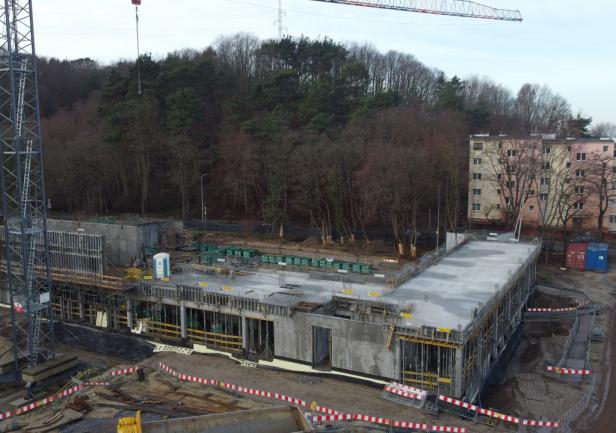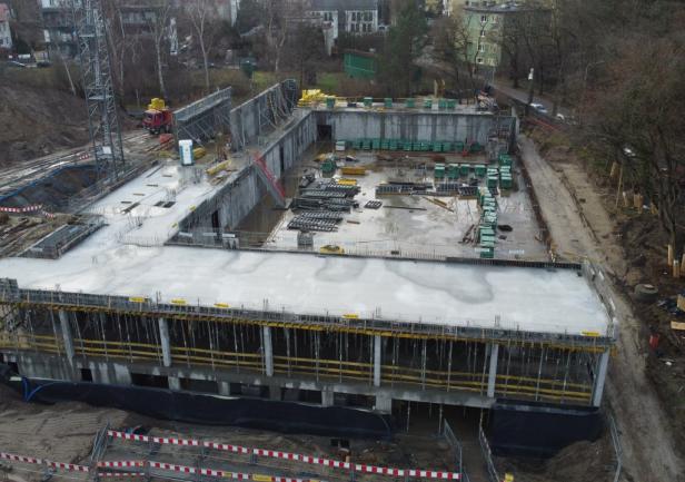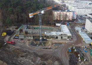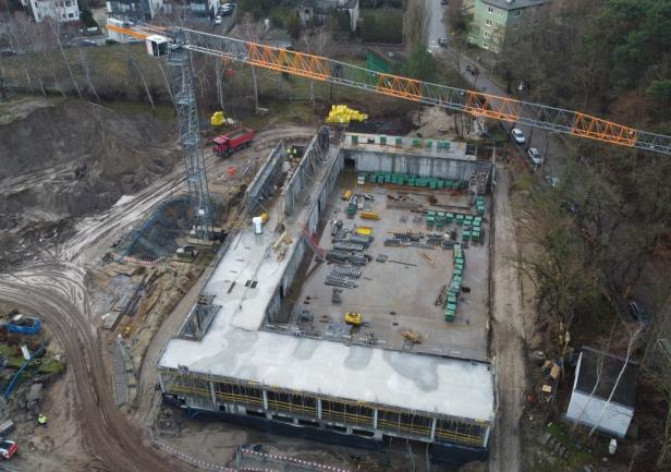 - the walls of the 1st floor, the staircase, and the elevator shafts up to the 1st floor. Work is currently ongoing on reinforcement and formwork on the first floor.