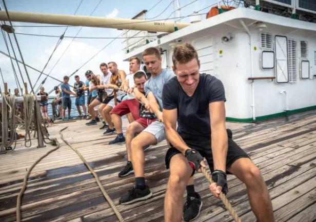 The story of Dar Młodzieży’s first weeks at sea is far from ordinary. During its first voyage, the ship left port in Gdynia on 10 July 1982 and headed for the port of Rostock, before arriving at the British port of Falmouth for the start of the Cutty Sark Tall Ships Races. On 27 July, the crew of Dar was involved in the rescue and transport of a sailor from the German yacht Peter Von Danzig, who sustained extreme burns following the explosion of the yacht’s on board oven. After the injured sailor was airlifted to hospital, Dar Młodzieży returned to the race, Where after covering 770 nautical miles, it took part in an exciting race to the finish on 29 July. The debuting ship finished in first place in Class A, beating its nearest rival, Gorch Fock, by 14 minutes and 18 seconds.