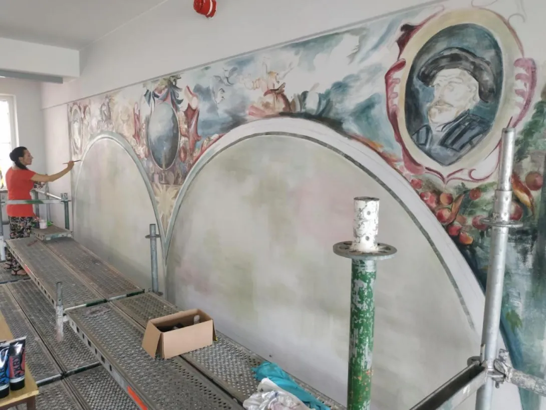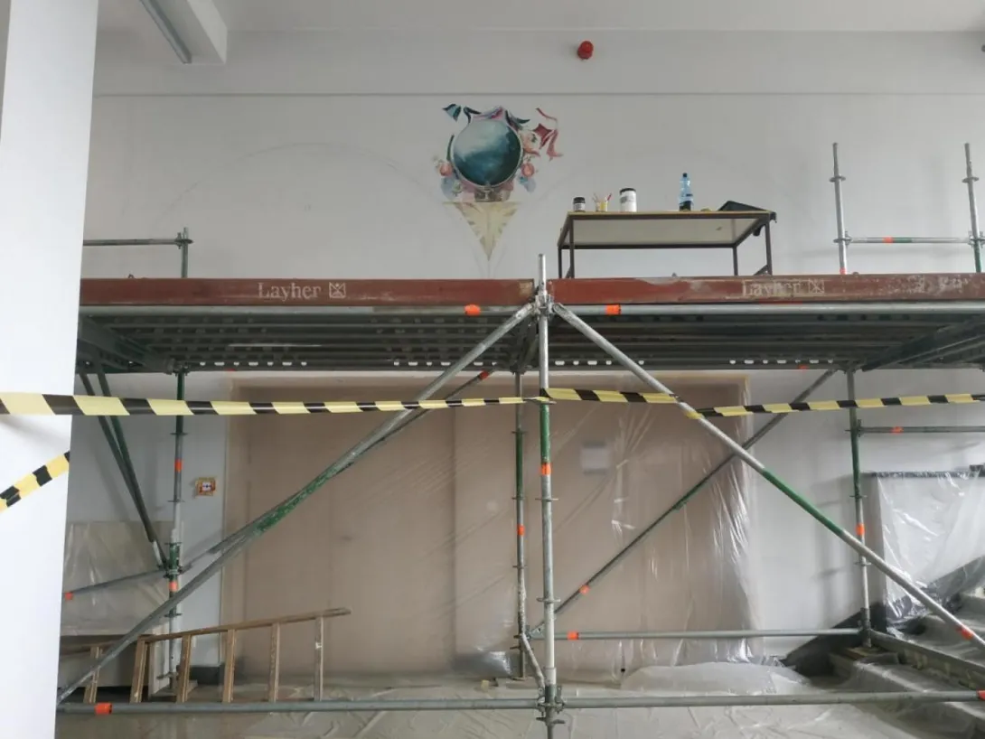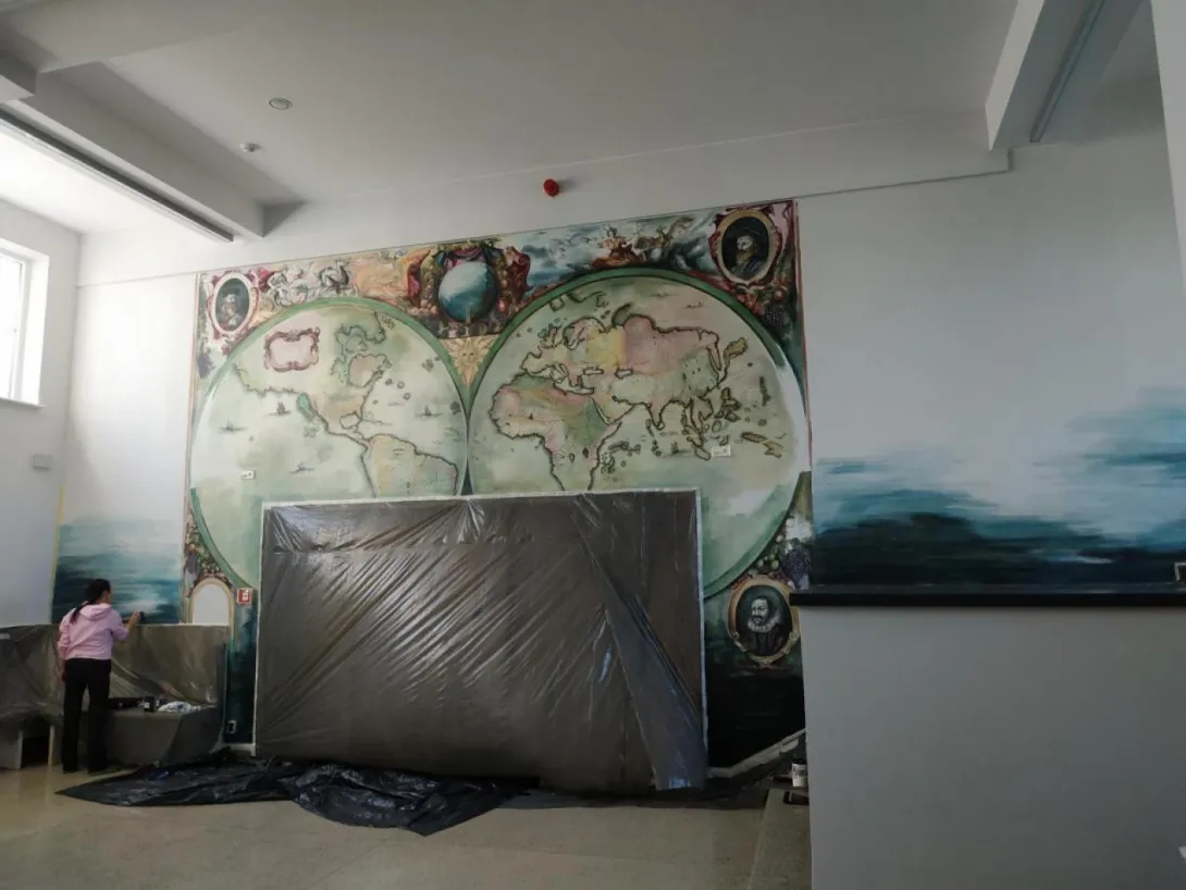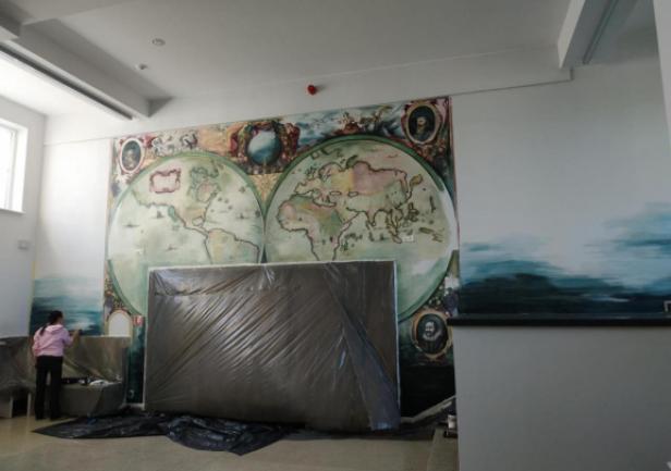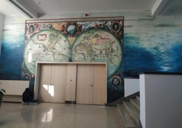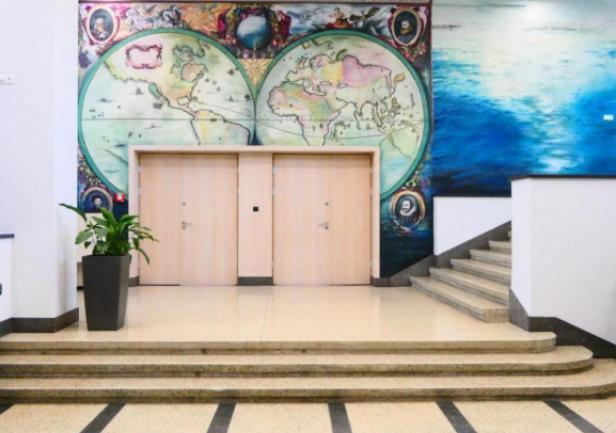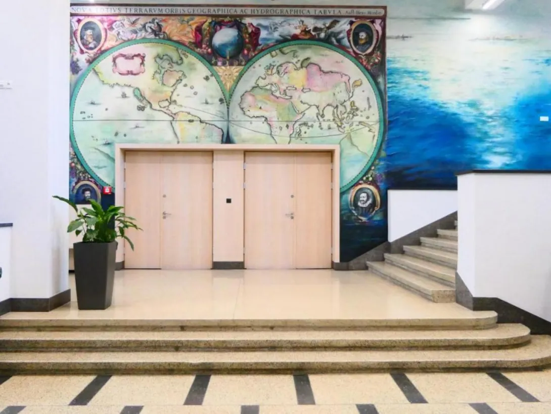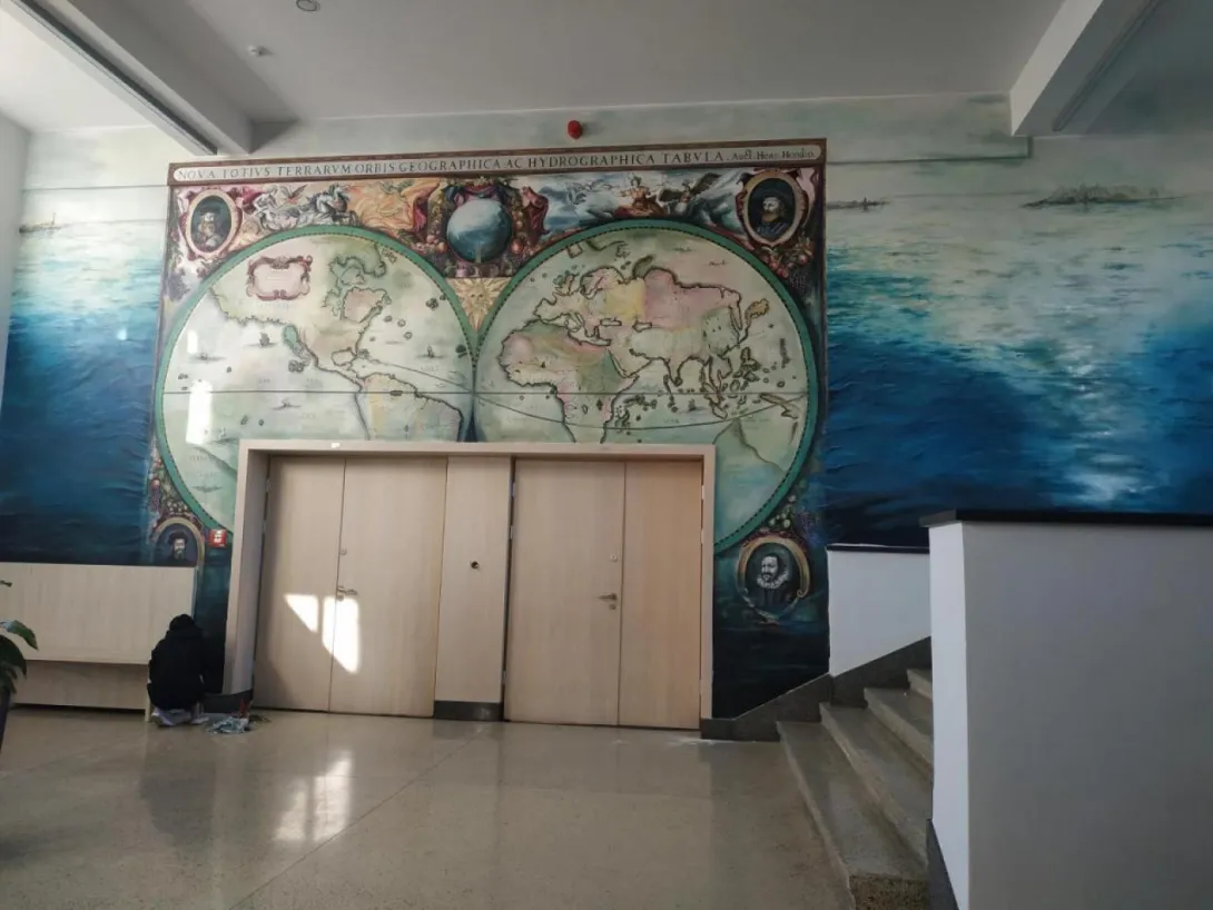 The mural, which beautifully adorns one of the walls of the Faculty of Navigation, is an artistic representation of the map of the world. In carrying out the work, artist Joanna Rogowska was inspired by a map of the world by Henricus Hondius, published in 1631 in the atlas Atlantis Marioris Appendix. The work also references a style of painting used in the 17th century.