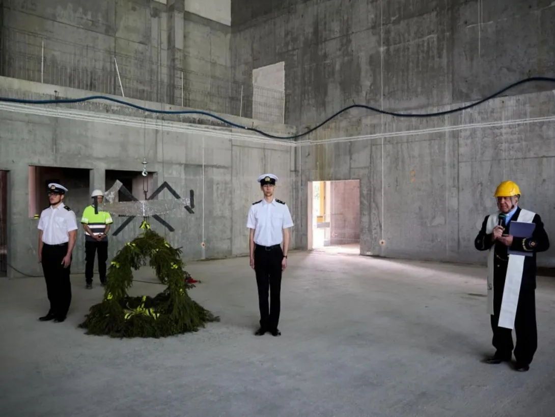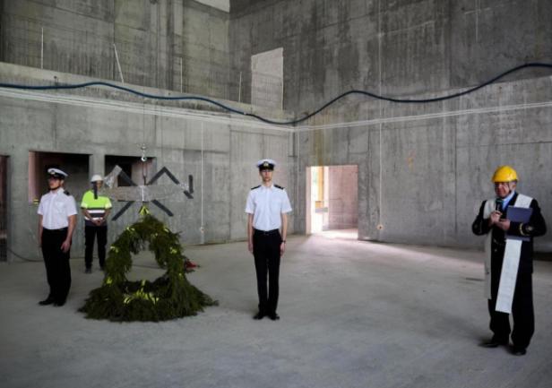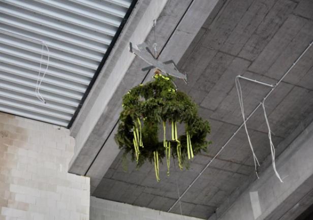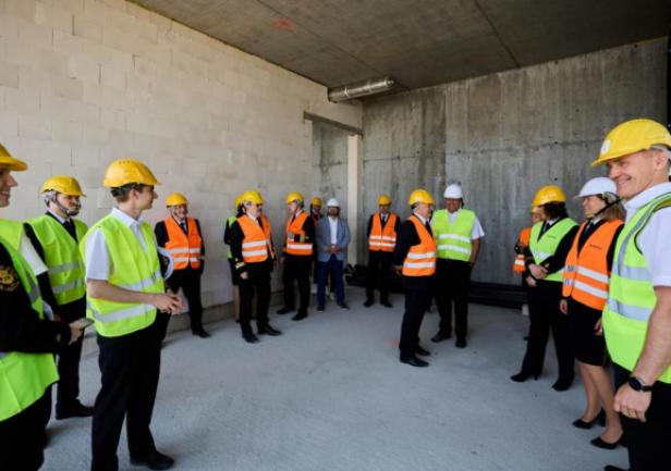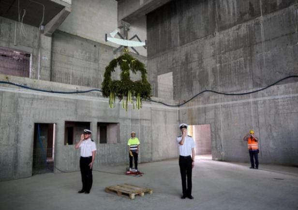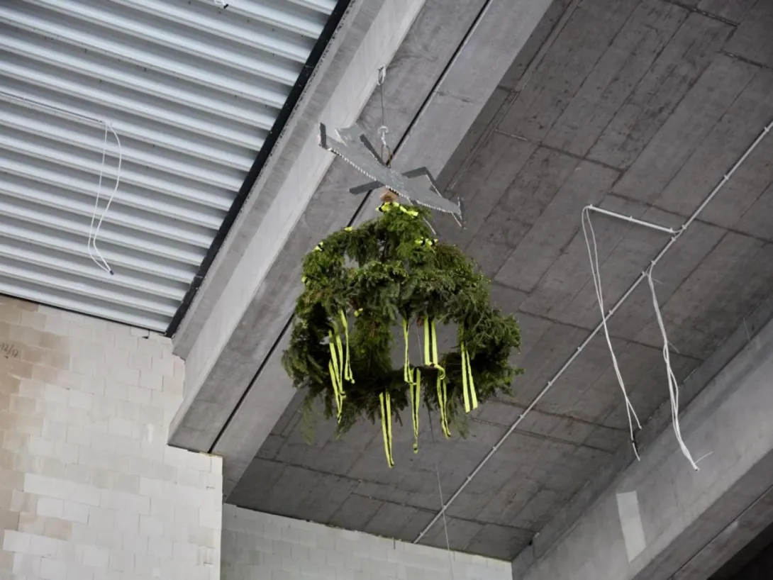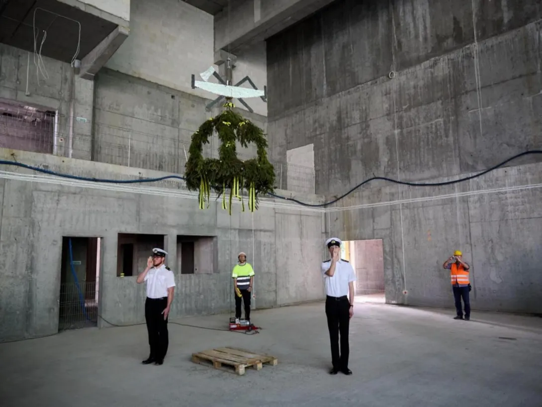 A wreath has been hung on the currently constructed GMU Sports Centre as part of a topping-out ceremony to mark the completion of the highest point of the building.