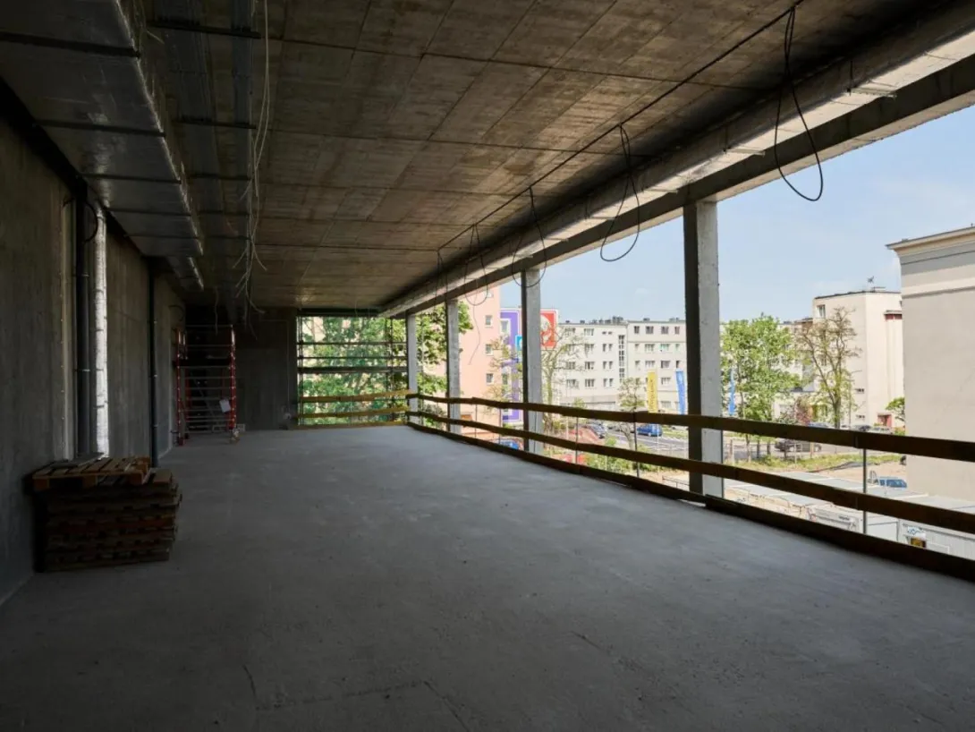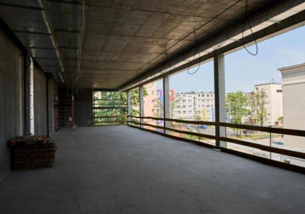 All reinforced concrete works are now completed and brick construction works are nearing completion. The roof has been fitted with a trapezoidal sheet with thermal insulation, and rock-wool insulation has been added to the ceilings in the garage hall. The installation of window frames and a wooden facade has begun on the Grabowo Street side of the building. Work has also begun on the elevation, plastering works in the parking garage and the ground floor of the building, as well as electrical and telecommunications and sanitary installations. The developer plans to complete the construction of the entire facade of the building and begin external road works by the end of September.