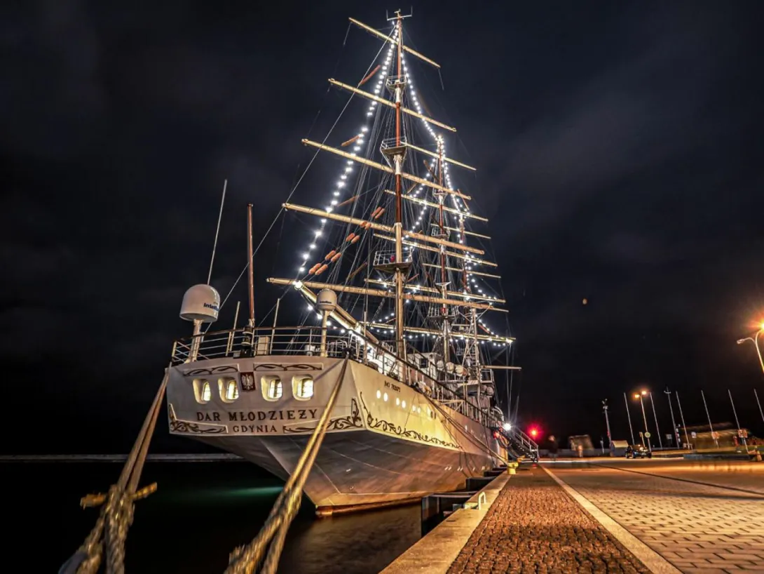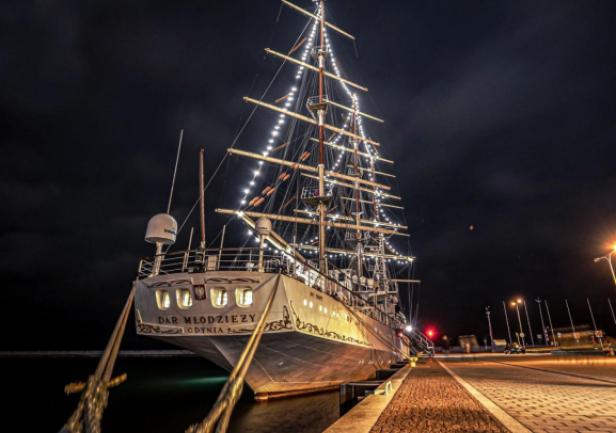 The masts of Dar Młodzieży are aglow with the light of 500 bulbs in the shape of a Christmas tree – the tallest in the Tricity.