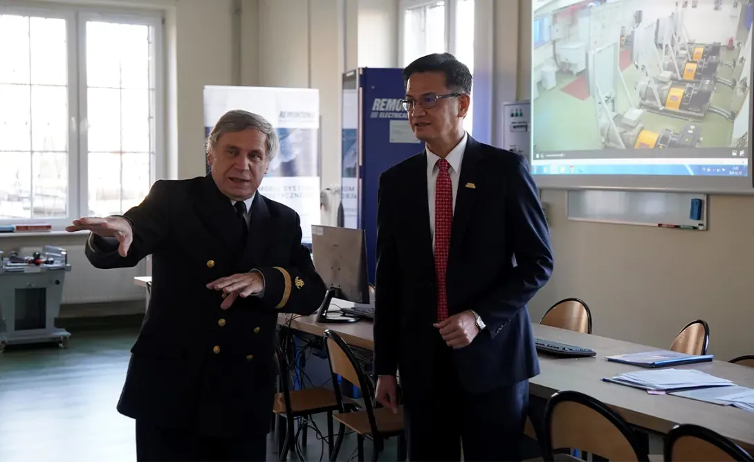 The next part of the visit included a demonstration of the Ship Power Plants Simulator in the Faculty of Electrical Engineering, during which guests had the opportunity to visit the University’s modern teaching infrastructure. The visit culminated with a shared dinner attended by Rafał Geremek, Deputy Mayor of Gdynia.