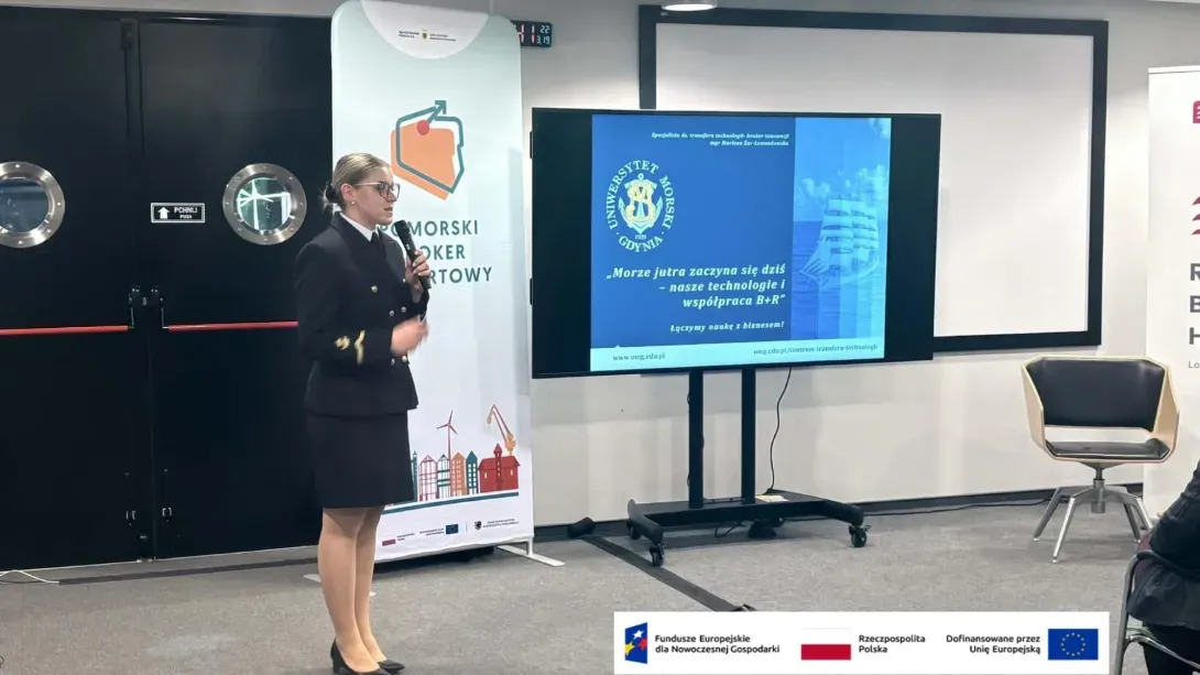 An important item on the programme was the presentation entitled “The Sea of Tomorrow Begins Today – Our Technologies and R&D Cooperation”, delivered by Marlena Żur-Lewandowska, a broker from the GMU Technology Transfer Office, at the invitation of the Polish Investment and Trade Agency. The presentation focused on innovative solutions developed at the University and on the possibilities for their implementation in cooperation with industry, in line with the objectives of the “Science4Business – Nauka dla Biznesu project carried out at the University, which aims to increase the effectiveness of cooperation between the University and business and to commercialise R&D results. The activity is implemented under Task No. 1, “Development Incubator,” of the non-competitive project “Science4Business – Nauka dla Biznesu,” co-financed by the European Union under Measure 2.5 of the European Funds for a Modern Economy Programme 2021–2027.