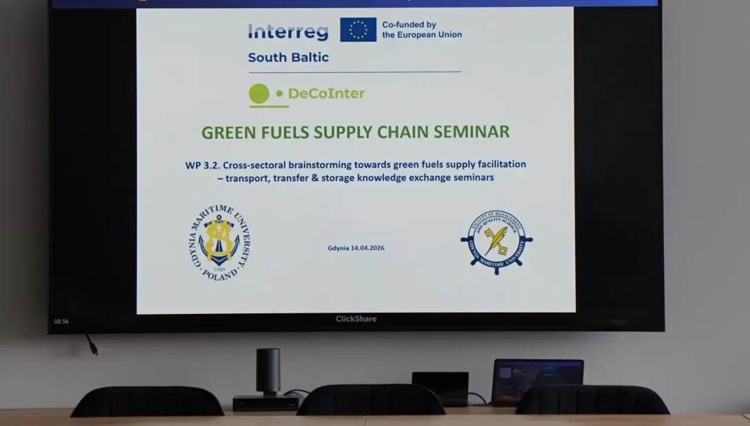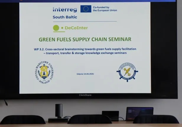 On 14 April 2026, the Green Fuels Supply Seminar was held at Gdynia Maritime University. The event was organised as part of the DeCoInter project (Decarbonization of the Maritime Sector and Its Impact on Green Energy Transition) and received financing under the Interreg South Baltic Programme 2021-2027, an EU-funded initiative for cross-border cooperation.