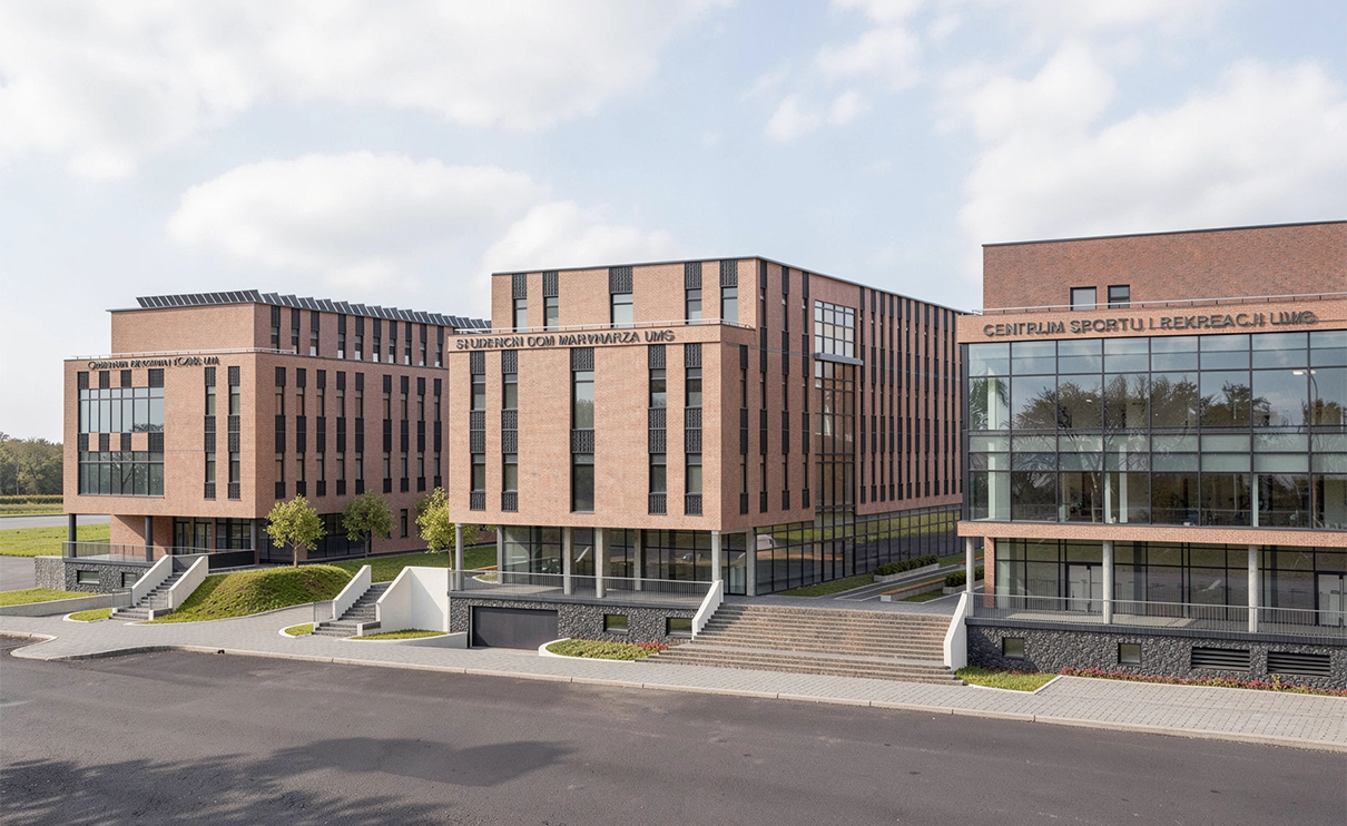 Another extremely important investment project is the construction of a new student dormitory, located in the immediate vicinity of the GMU Sports and Recreation Centre, which opened in 2024. The main function of the newly designed building will be to accommodate the University’s students and doctoral candidates on four above-ground floors intended for rooms with bathrooms and kitchenettes. The new student residence will provide more than 350 beds, together with office and technical facilities and an underground parking garage.