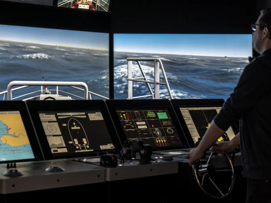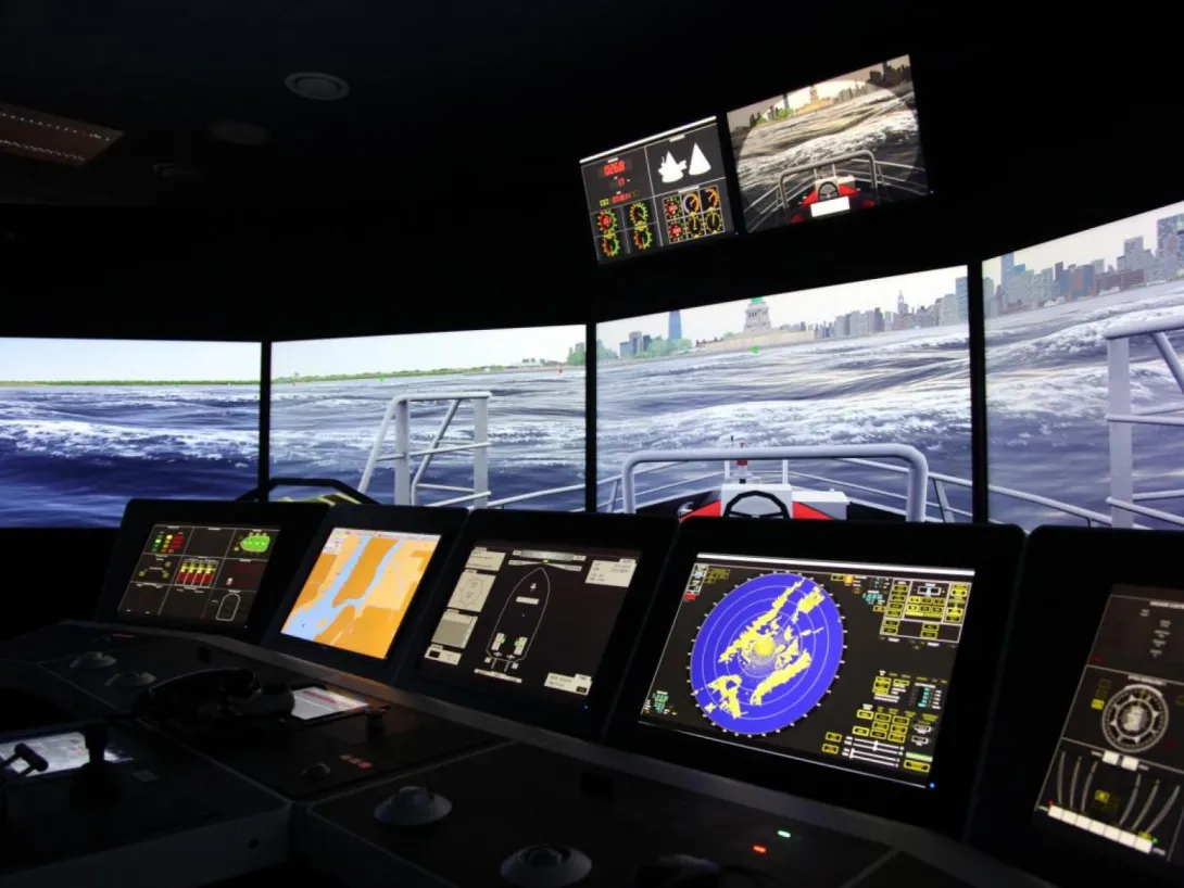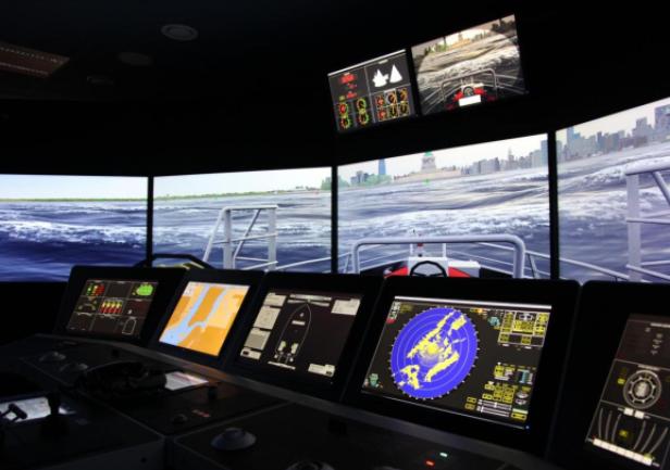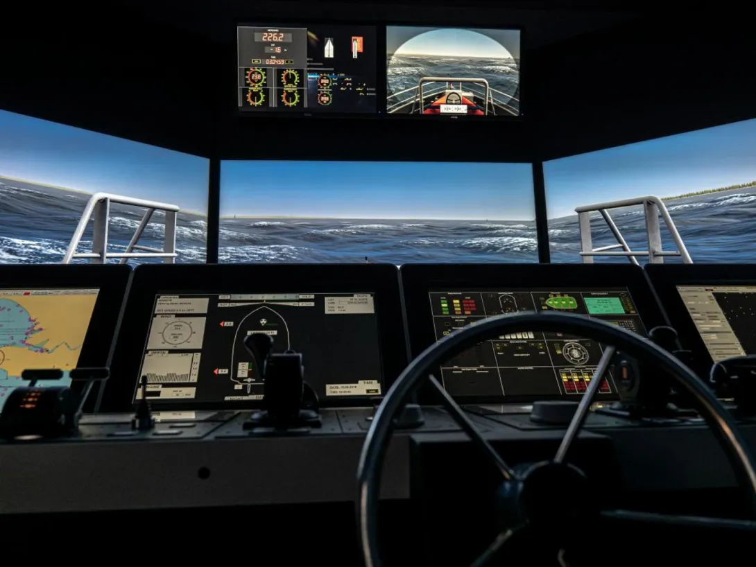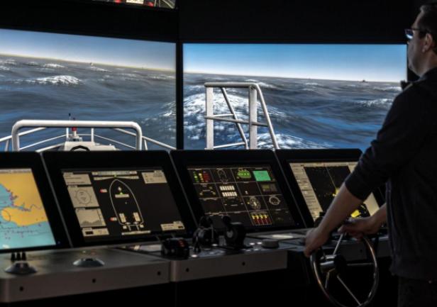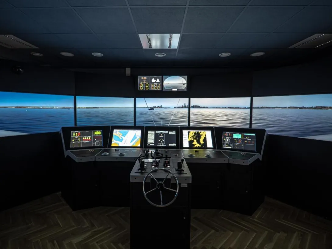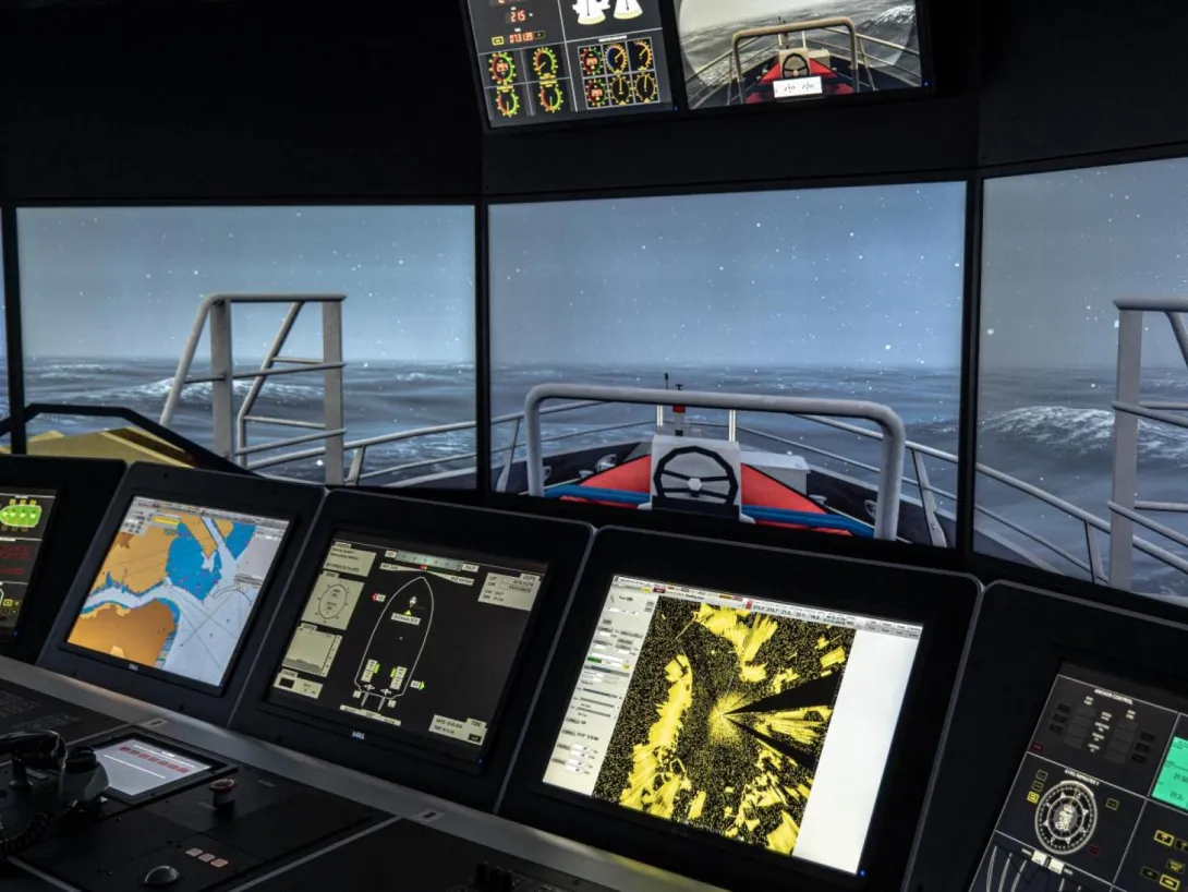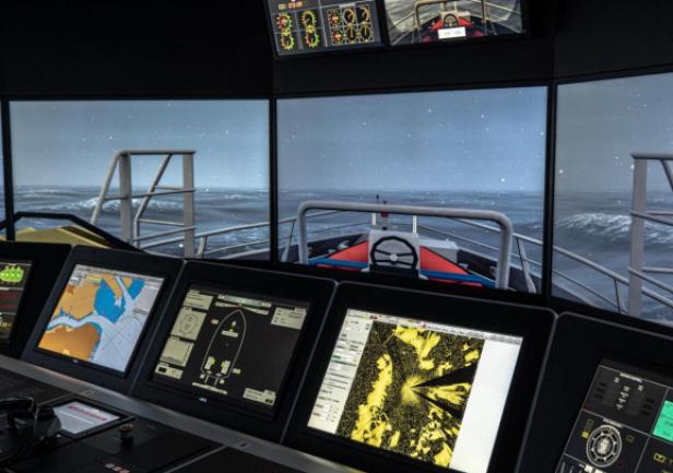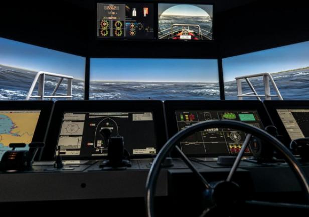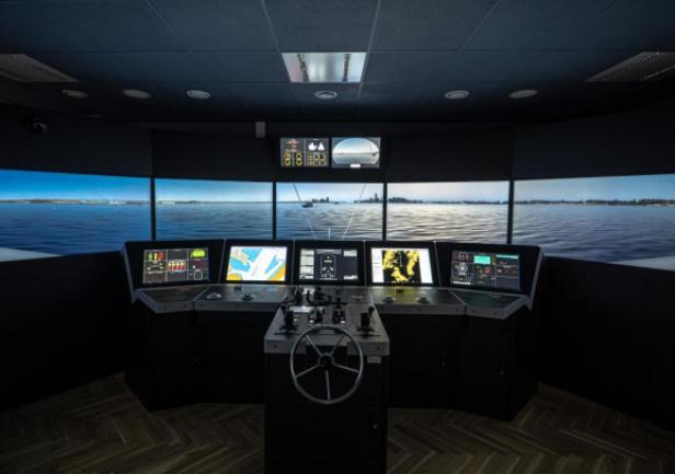 The simulator comprises four separate navigation bridges and an instructor’s room that also serves as a briefing and discussion area. One of the bridges offers a 180° visual system, while the three smaller bridges are equipped with additional digital components.
