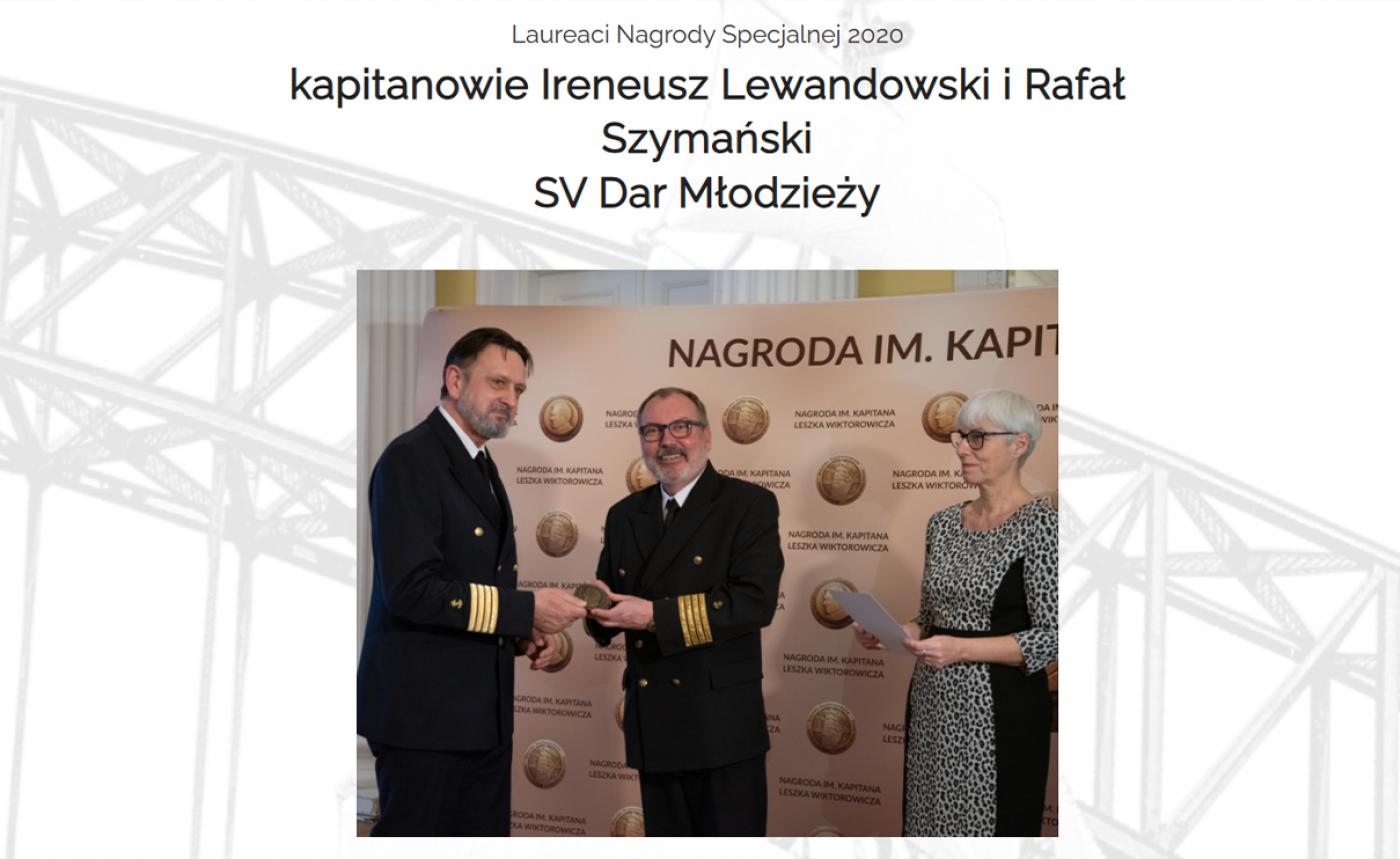 A Special Captain Leszek Wiktorowicz Award was given to Captains Ireneusz Lewandowski and Rafał Szymanski who captained the Dar Młodzieży during the Independence Sail The captains were honoured for their contribution to the success of the historic voyage of the “Dar Młodzieży” around the world, the popularisation of sailing, and the seafarer training of young people.